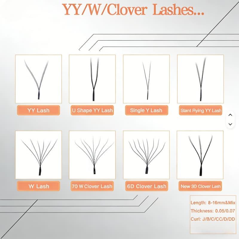 ขนตาโคลเวอร์ 3 มิติ 4 มิติ 5 มิติ ขนาด 0.07 มม. แบบไขว้ ขนตาโคลเวอร์แบบกำหนดโลโก้เองได้ ขนาด 0.05 มม. 6 มิติ 7 มิติ 8 มิติ รูปทรง W ขนาด 8-15 มม. ต่อขนตาโคลเวอร์