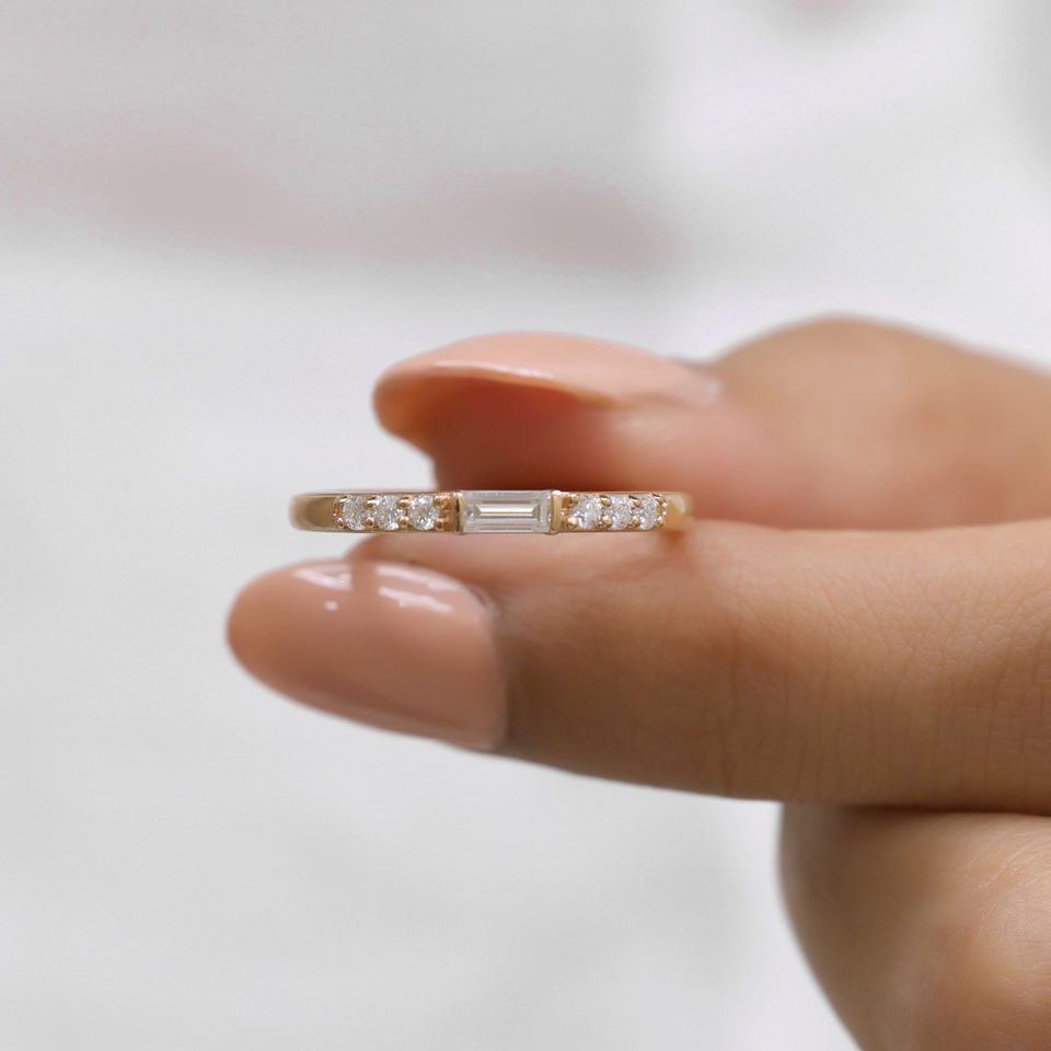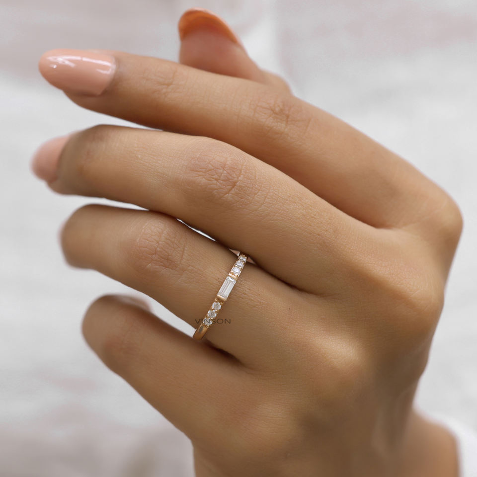 ชุดแหวนเพชรโมอิสสีทอง18K สำหรับงานแต่งงานครบรอบปีของเจ้าสาว0.17 caguette ทรงกลมตัดเพชรโมอิส