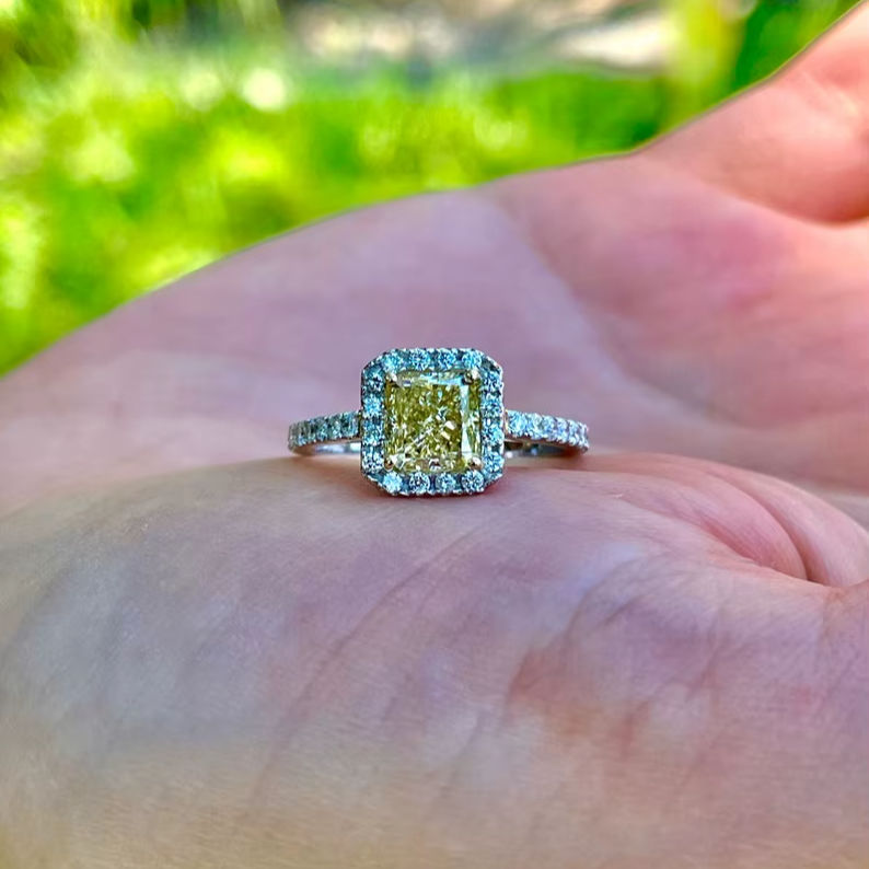 แหวนเพชรโมอิสซาไนต์ทรงเรเดียนท์คัท น้ำหนัก 0.51 กะรัต สีเหลืองเข้มแฟนซี สำหรับผู้หญิง ของขวัญ แหวนแบบวงแหวนประดับเพชร ทองคำขาว 14K เครื่องประดับคลาสสิก