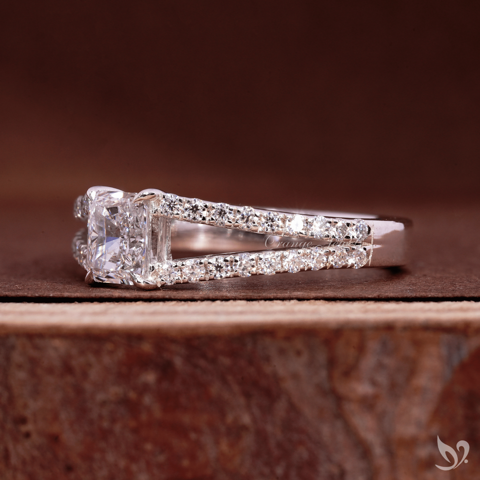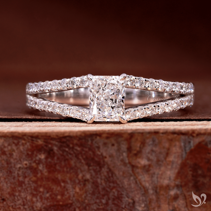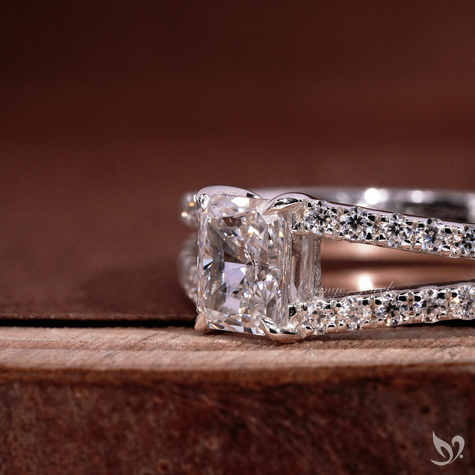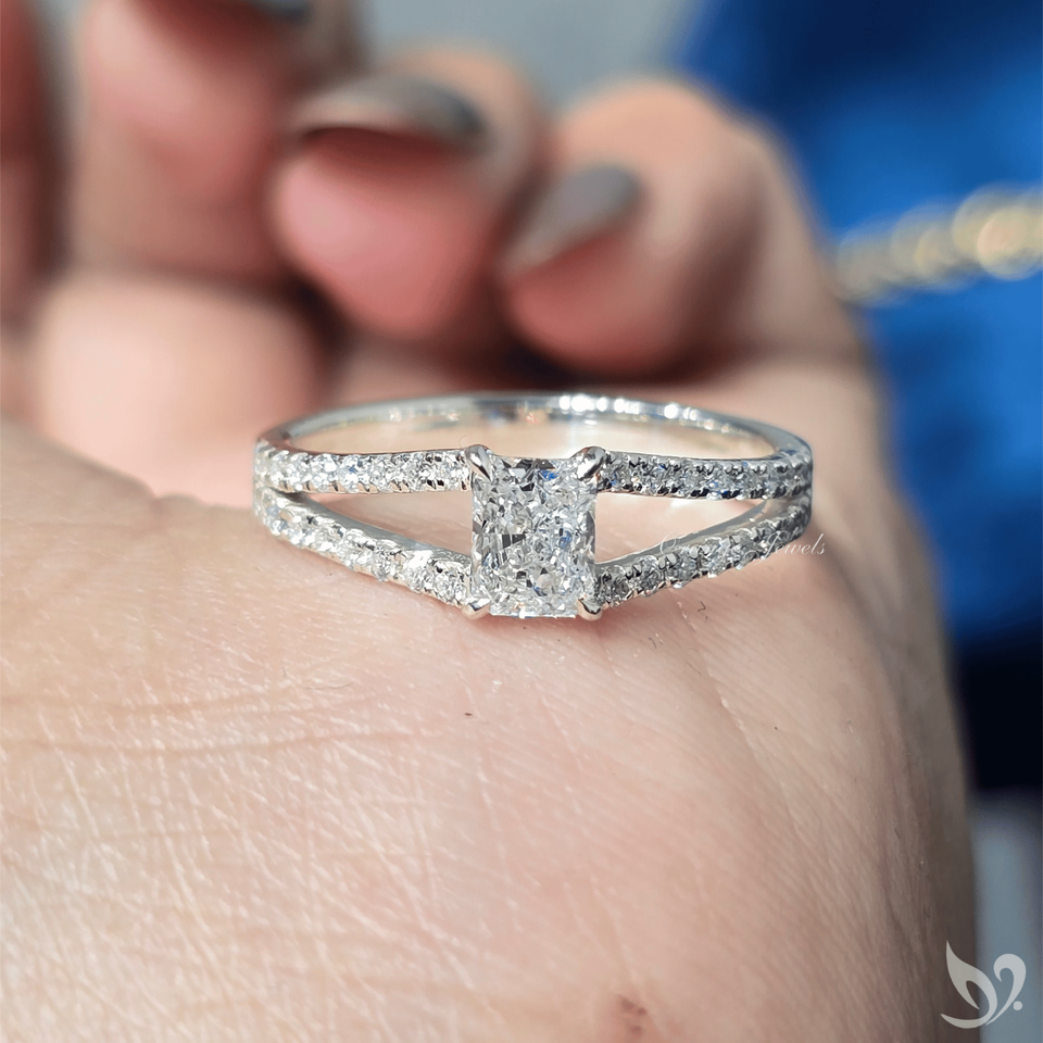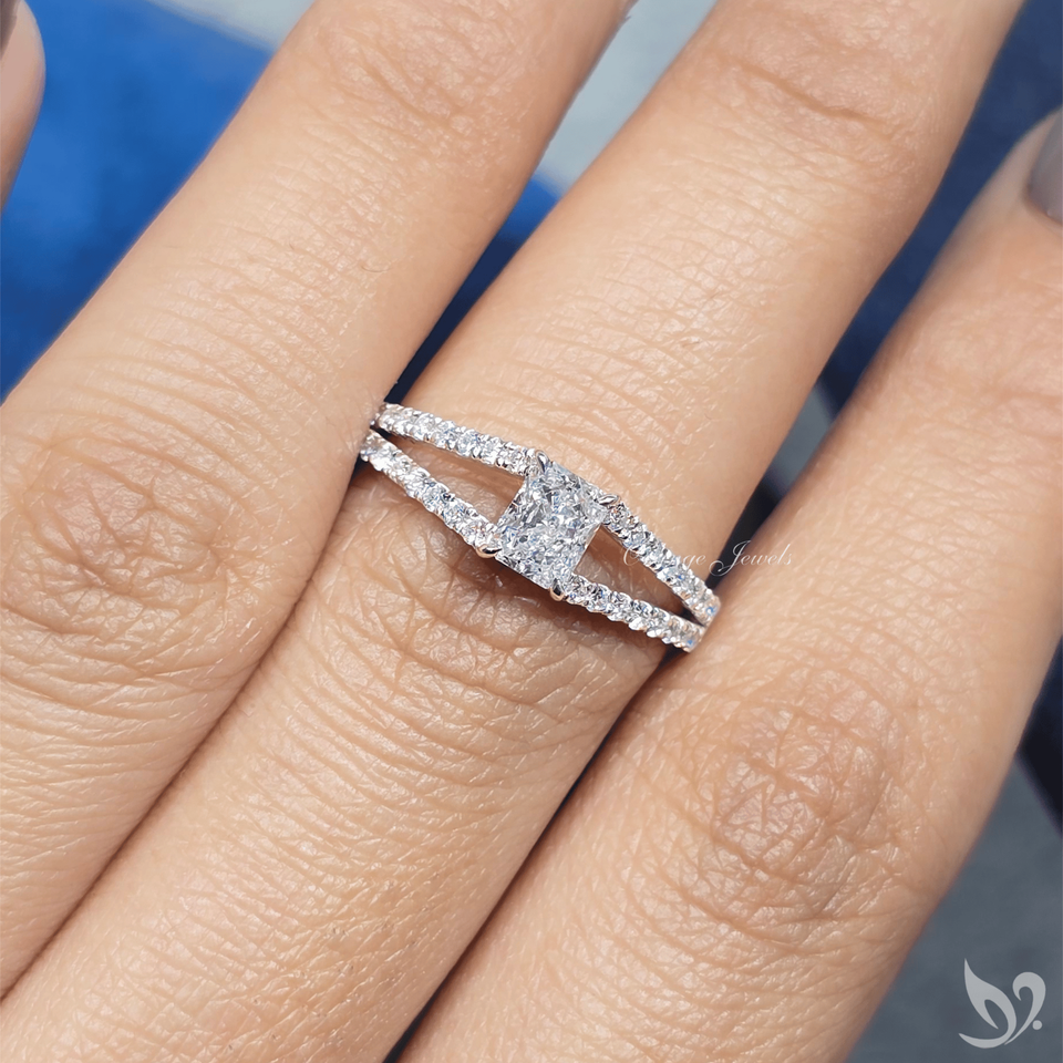 แหวนหมั้นเพชรทรงรัศมี 0.5 กะรัต เพชรเพาะเลี้ยงในห้องปฏิบัติการ ประดับเพชรแบบสปลิตพาเว่ ทองคำขาว พร้อมใบรับรอง IGI ดีไซน์เรียบหรู ทันสมัย