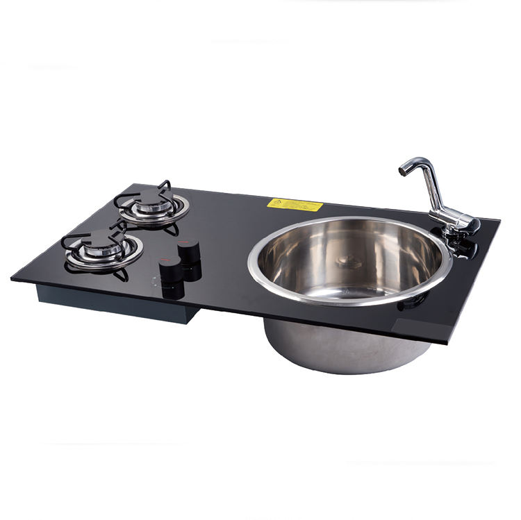 เตาแก๊ส RV กระจกนิรภัย0.8มม. เตาแก๊สสองหัวสำหรับรถพ่วงอ่างล้างจานแบบโค้งมน