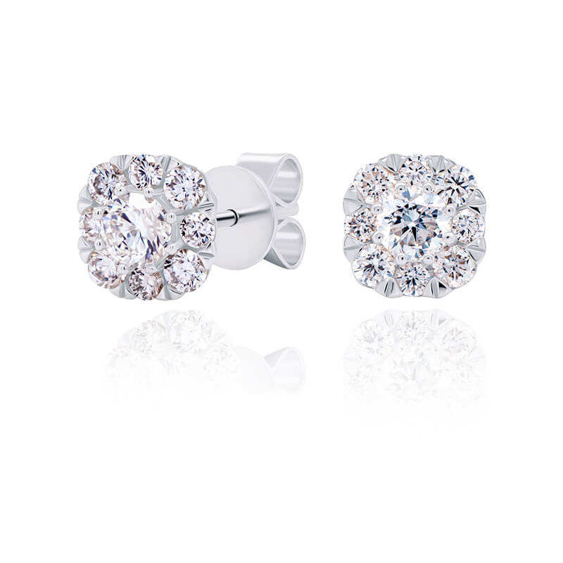 ต่างหูเพชรทรงบริลเลียนต์ 0.90 กะรัต เพาะเลี้ยงในห้องปฏิบัติการ รูปทรงคลัสเตอร์ ประดับเพชรแบบสตั๊ด ได้รับการรับรองจาก IGI ทอง 10 กะรัต ชุบโรเดียม ดีไซน์ทันสมัย เหมาะสำหรับเป็นของหมั้น หรูหรา