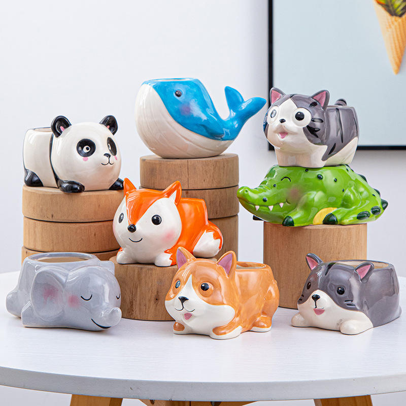 0A58 Cute Small Animal Fox Cat Panda Corgi Dog Elephant Ceramic Succulent Planter Pot Bonsai Plant Cactus Flower Pots