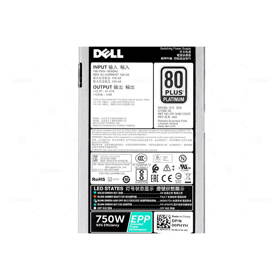 0PHYH DELL 750W 80 PLUS PLATINUM แหล่งจ่ายไฟสำหรับ R740 R740XD ปรับปรุงใหม่