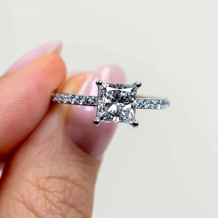 แหวนหมั้นเพชรทรงปรินเซสคัท 1.00 กะรัต ระดับหรู สี E ความสะอาด VVS2 เพชรเลี้ยงในห้องปฏิบัติการ รับรองโดย IGI ตัวเรือนทองคำแท้ 18K/14K/10K ประดับเพชรแบบ Pave
