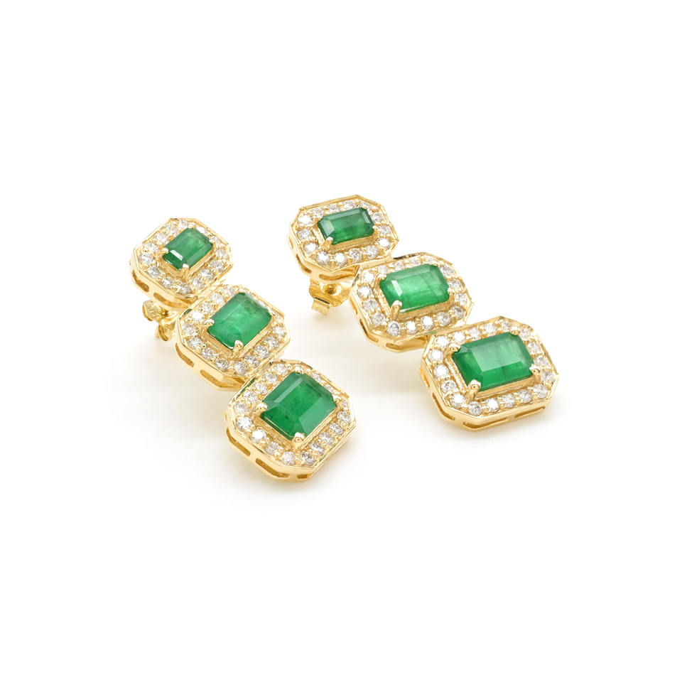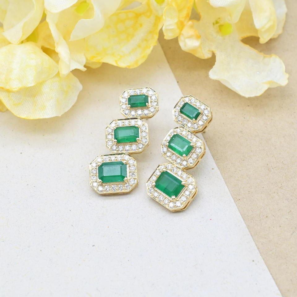 ต่างหูเพชรแท้สีขาว 1.09 กะรัต ประดับเพชรหลายเม็ดทรงรัศมี ตัวเรือนทองคำแท้ 14k สีเหลือง ประดับมรกต ต่างหูสำหรับผู้หญิง ของขวัญวันครบรอบที่สมบูรณ์แบบ