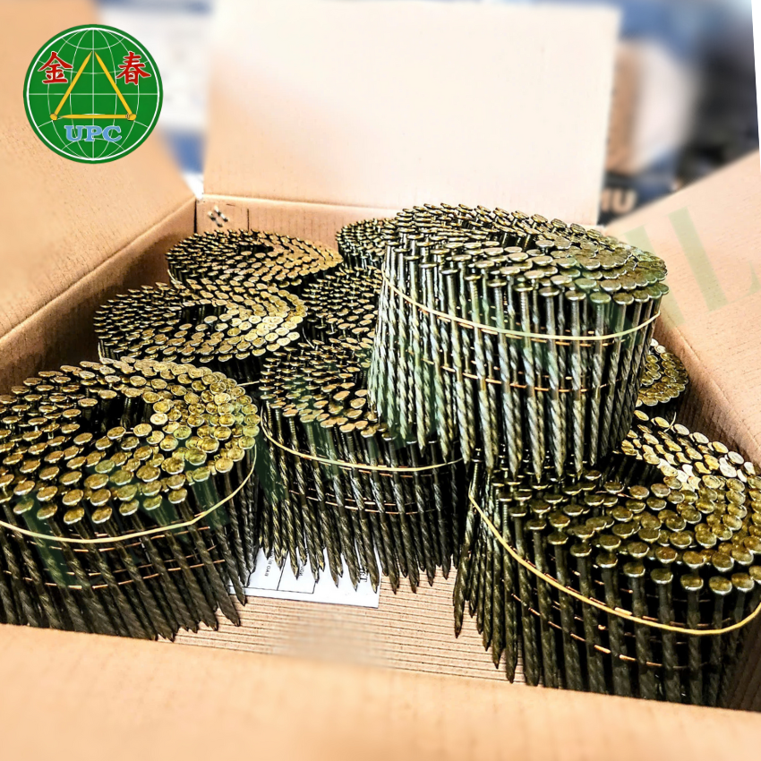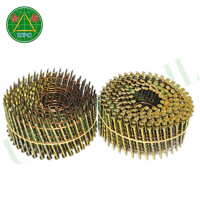 ตะปูม้วนลวดพาเลท1-1/4นิ้ว14000ชิ้น15-16องศาห่วงเคลือบสีเหลืองก้านเรียบ/สกรูสำหรับพาเลทไม้