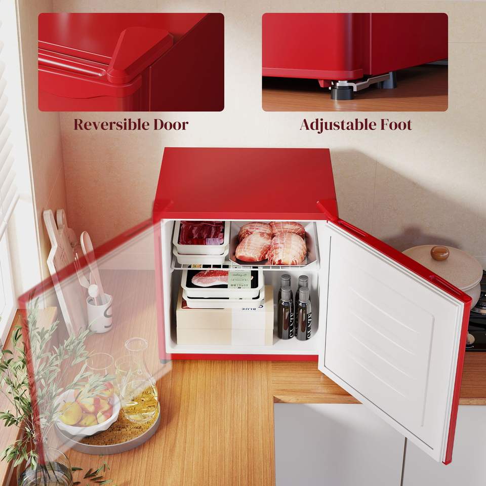 ตู้แช่แข็งแนวตั้งขนาดกะทัดรัด 1.1 คิว พร้อมชั้นวางแบบถอดได้ ตู้แช่แข็งขนาดเล็กแบบตั้งโต๊ะ สีแดง