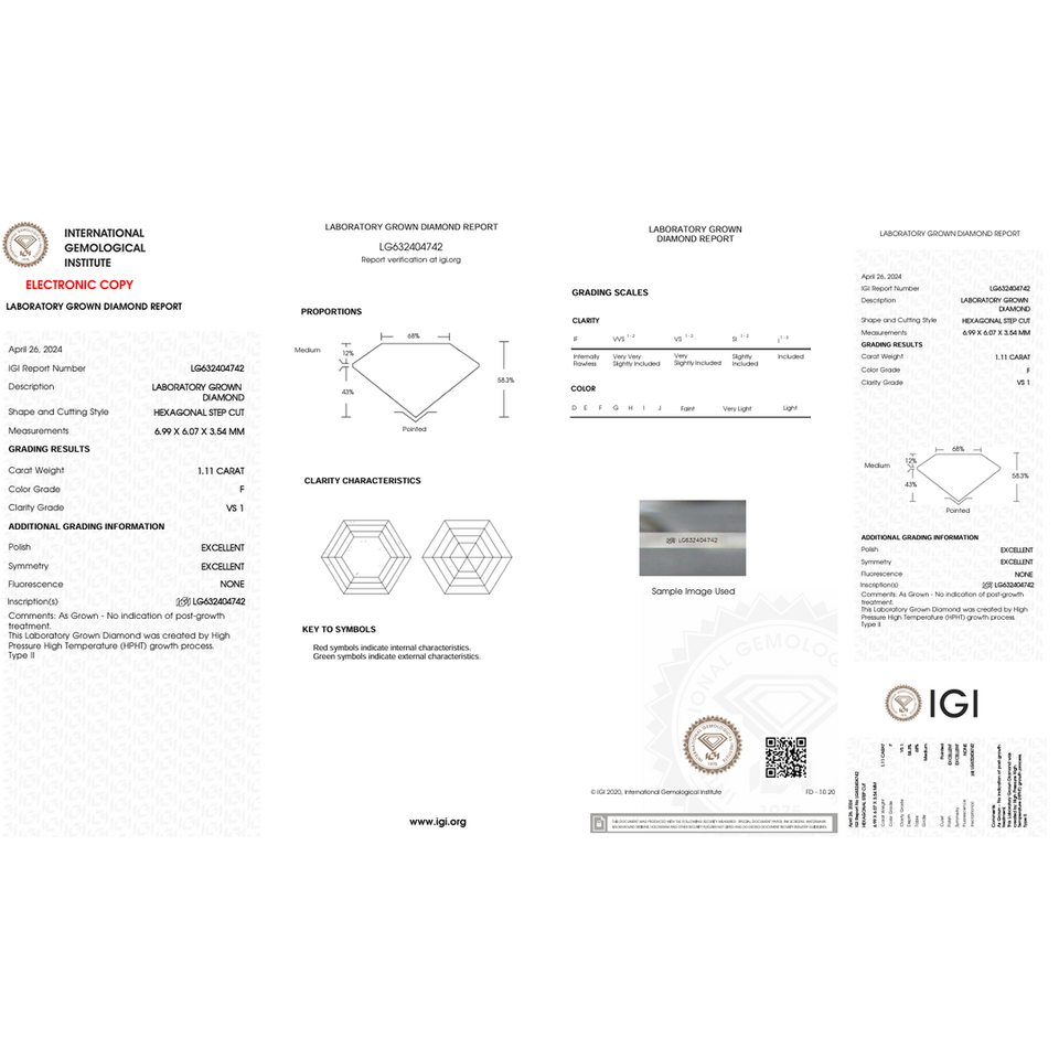 ต่างหูเพชรทรงหกเหลี่ยม 1.11 กะรัต สี F ความสะอาด VS1 เพชรเลี้ยงในห้องปฏิบัติการ ได้รับการรับรองจาก IGI ชุบทอง สำหรับใช้เป็นเครื่องประดับ