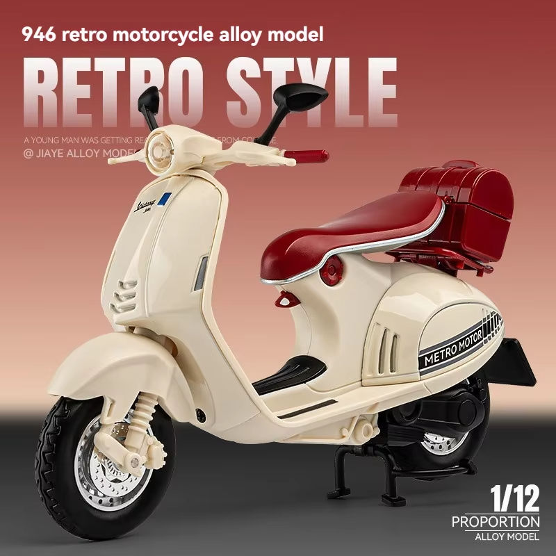 โมเดลรถมอเตอร์ไซค์รถเวสป้า946ตราชั่ง1:12ไฟเสียงรถยนต์แบบเก่าเครื่องประดับโลหะอัลลอยด์
