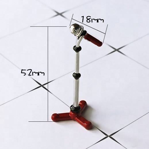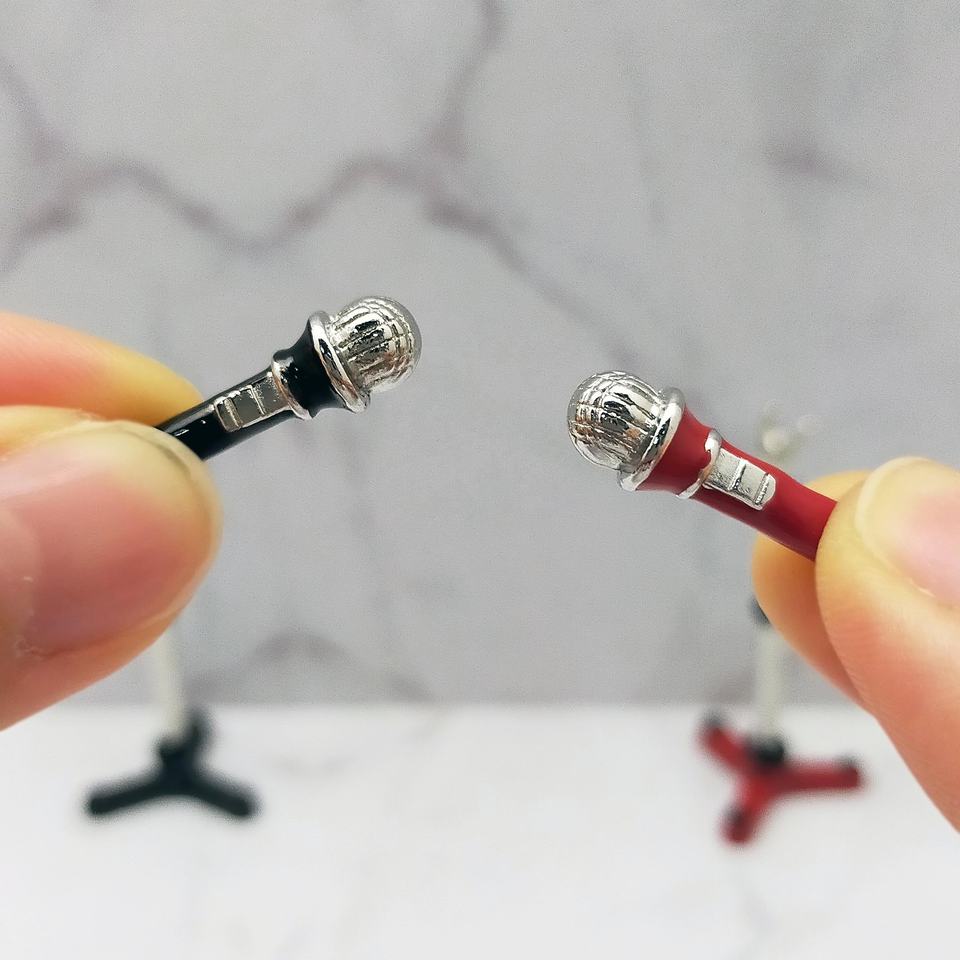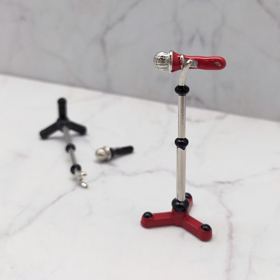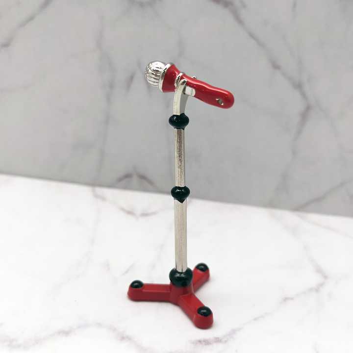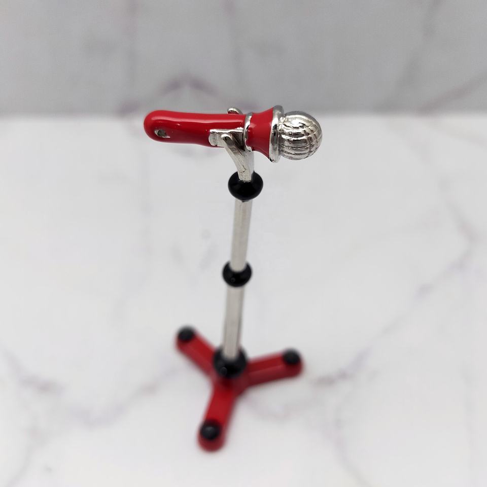 ไมโครโฟนสีแดงเคลือบโลหะขนาด 1:12 พร้อมขาตั้งสำหรับตั้งเวทีบ้านตุ๊กตา-อุปกรณ์เสริมดนตรี