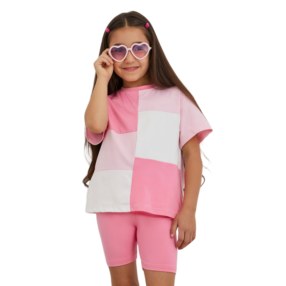 ชุดเสื้อผ้าเด็กผู้ชาย เด็กผู้หญิง และเด็กทารก อายุ 1-14 ปี เสื้อยืดคัลเลอร์บล็อกพร้อมกางเกงขาสั้นทรง Biker ผ้าฝ้าย ชุดกางเกงขาสั้นฤดูร้อน ชุดฤดูร้อน