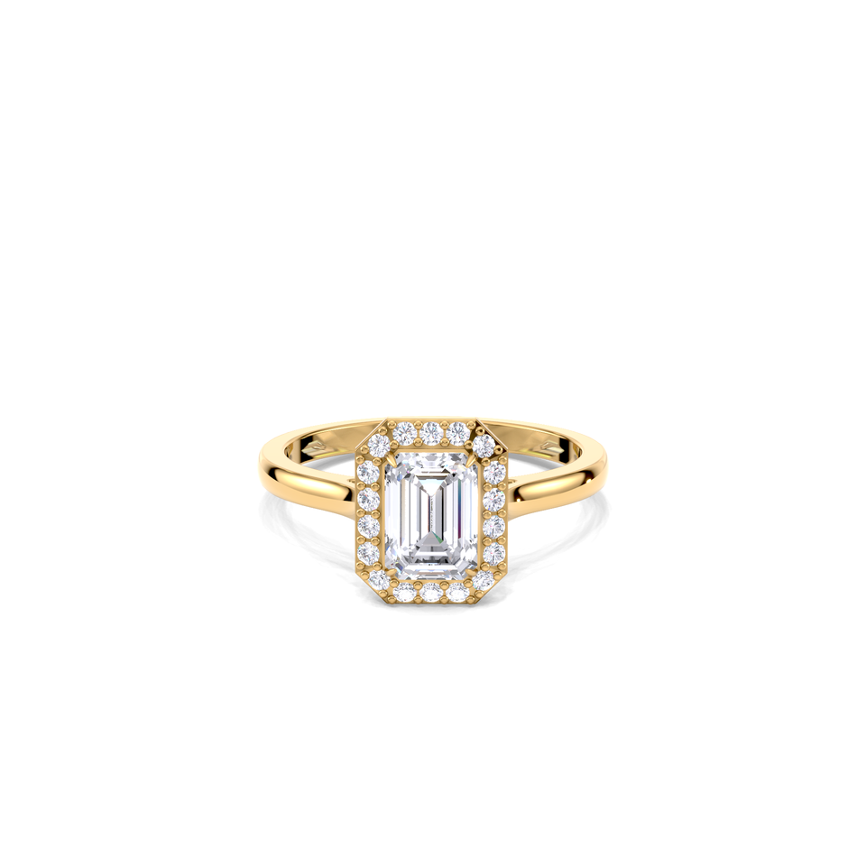 แหวนหมั้นเพชรทรงเอเมอรัลด์ 1.18 กะรัต ประดับด้วยเพชรแบบฮาโล ตัวเรือนทองคำ 9K สีเหลือง ขาว และโรสโกลด์ ดีไซน์ทรงเรขาคณิต