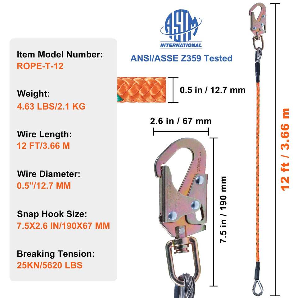 สายรัดนิรภัยสำหรับนักปีนต้นไม้ขนาด 1/2 นิ้ว x 12 ฟุต พร้อมห่วงเกี่ยวแบบ Snap Hook ทำจากอลูมิเนียมอัลลอยด์ อุปกรณ์และอุปกรณ์เสริมสำหรับปีนเขา