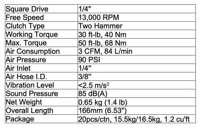 แรงบิดในการทำงาน:30ฟุต-ปอนด์