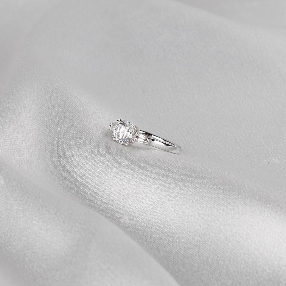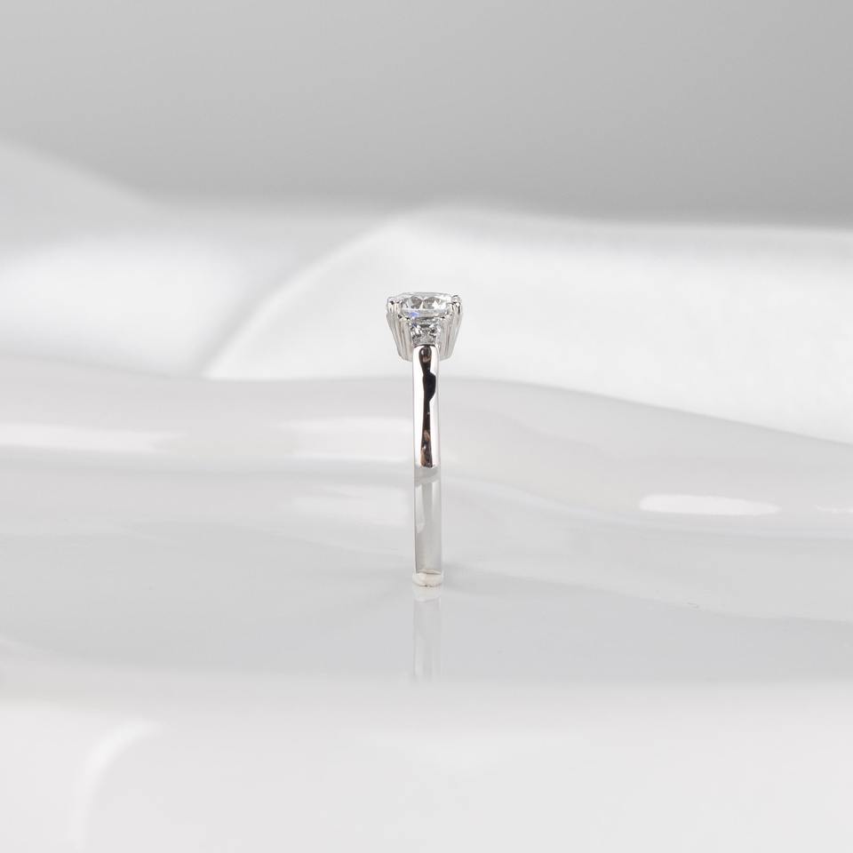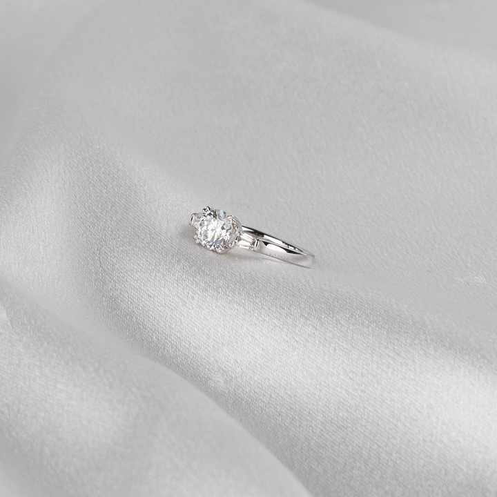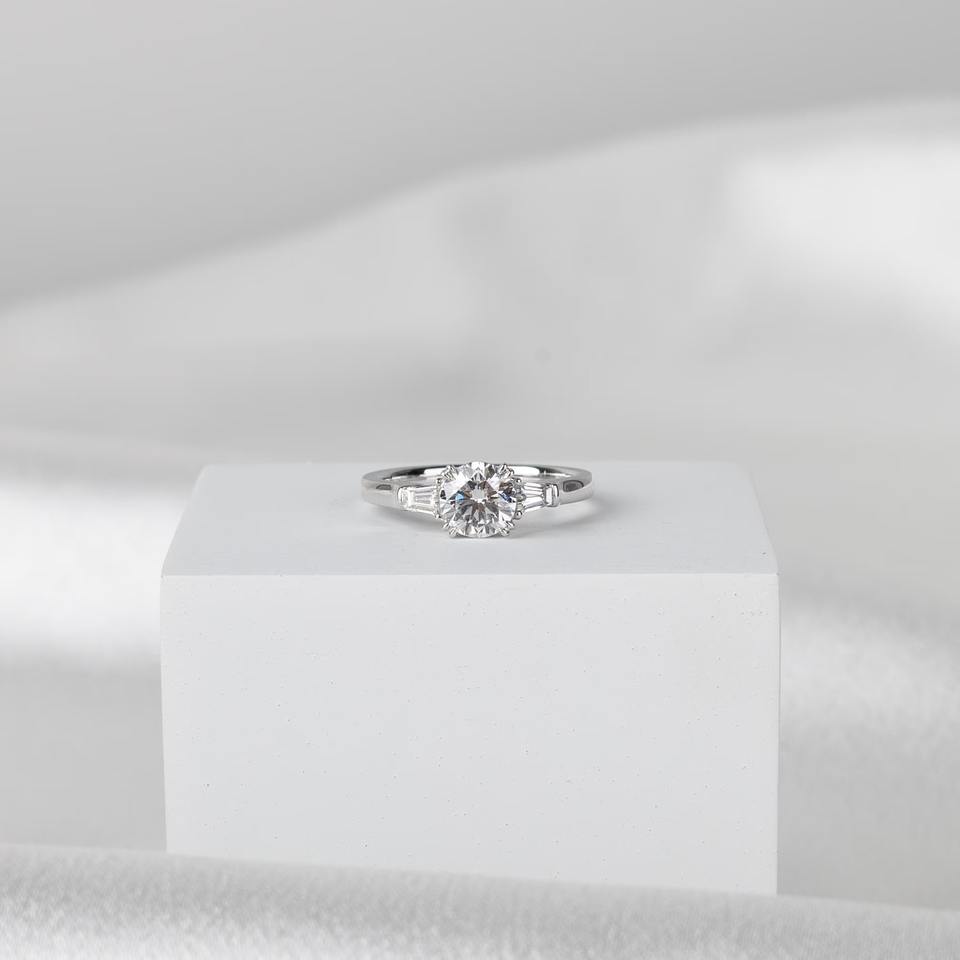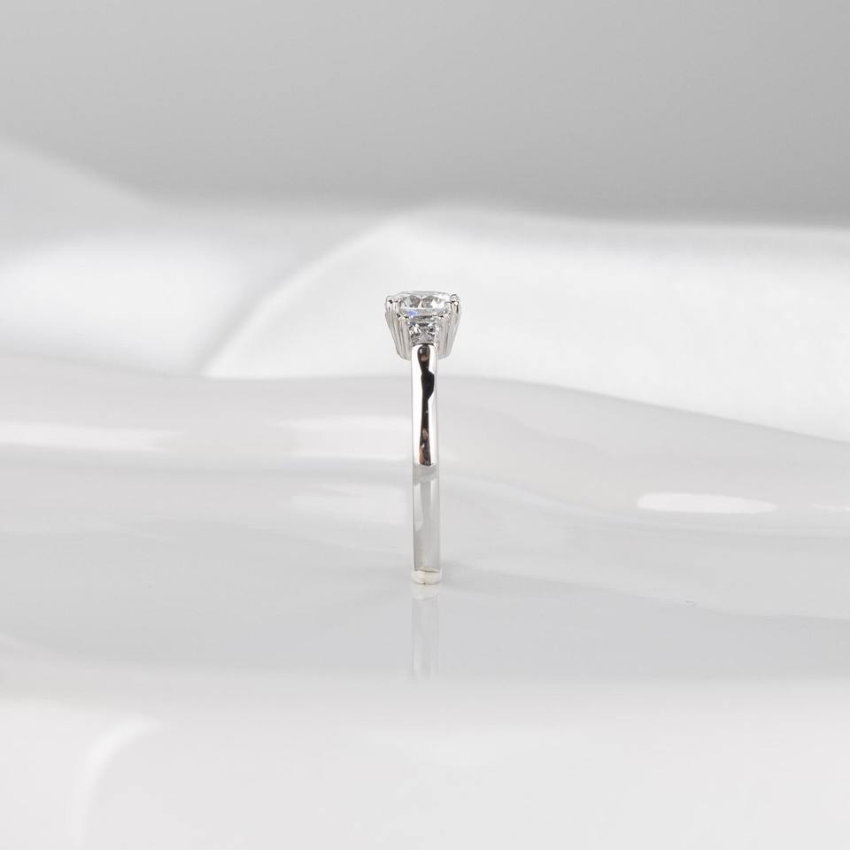 แหวนเพชรเพาะเลี้ยง 1.20 กะรัต D VVS2 ทรงกลมประดับเพชรทรงสี่เหลี่ยมคางหมูด้านข้าง ทองคำขาว 14K รับรองโดย IGI สำหรับงานหมั้น