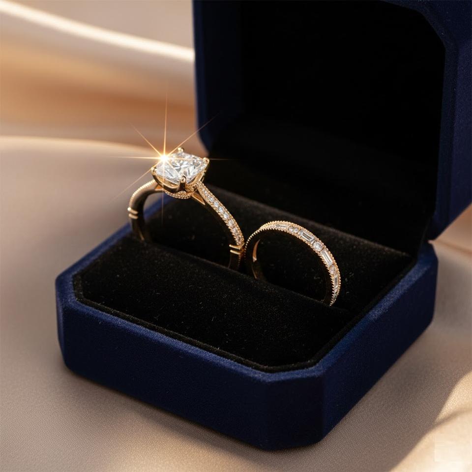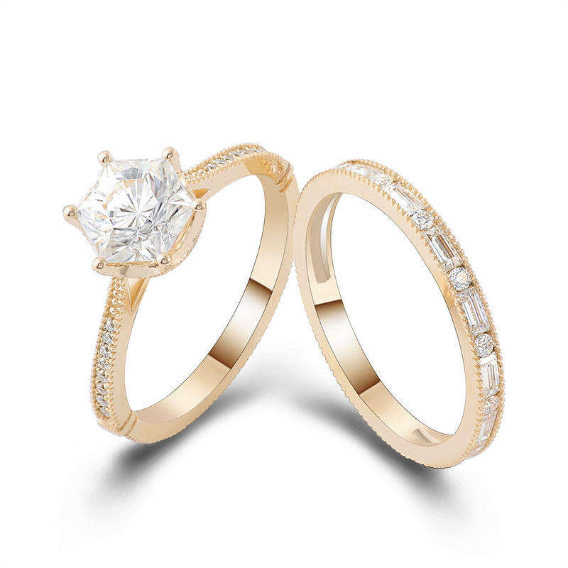 แหวนหมั้นโมอิสซาไนต์ทรงหกเหลี่ยม 1.25 กะรัต ประดับขอบแบบมิลเกรน พร้อมแหวนแต่งงานแบบบาแก็ตต์ ชุดแหวนเจ้าสาวแบบช่อง แหวนคู่เข้าชุด
