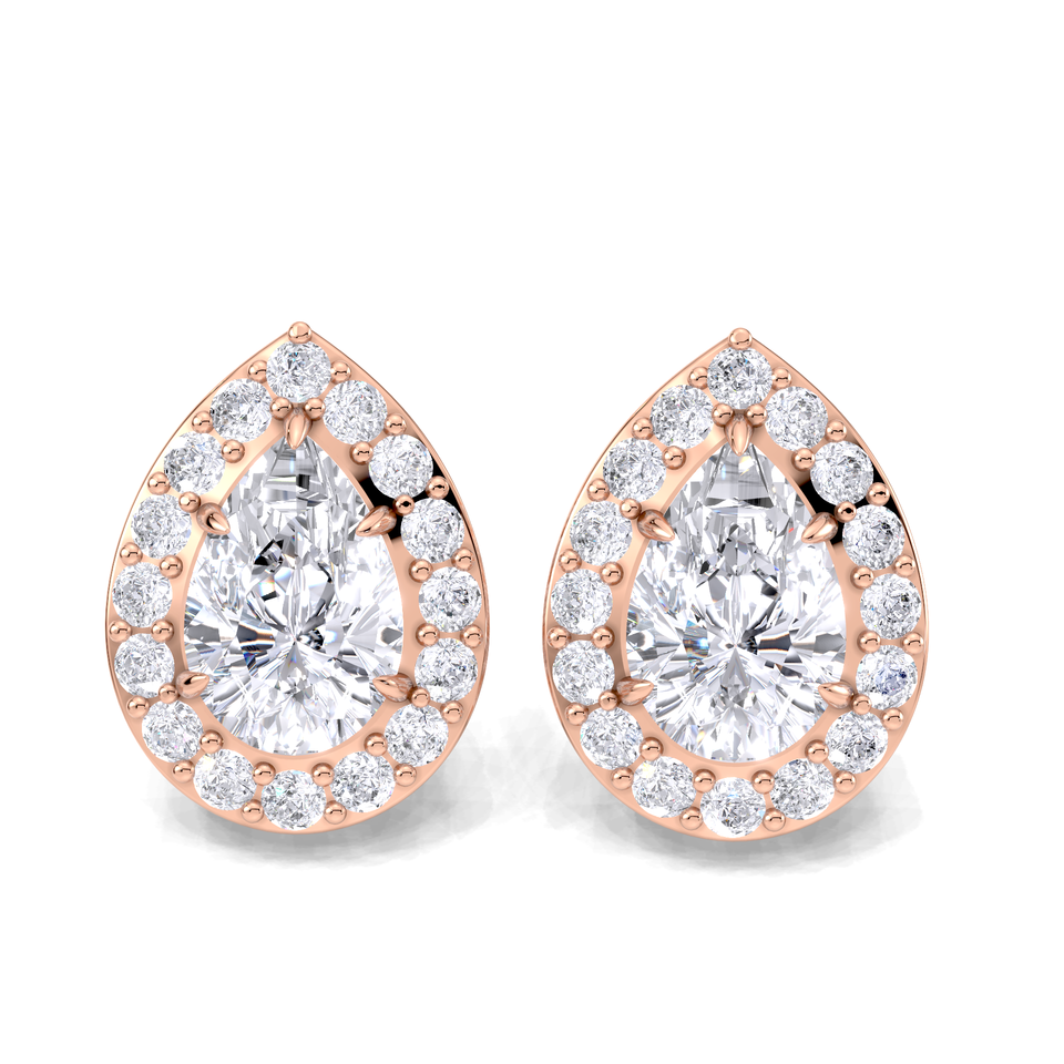 ต่างหูเพชรทรงลูกแพร์ 1.25 กะรัต ประดับด้วยเพชรแบบฮาโล ตัวเรือนทอง 9K สีเหลือง ขาว และโรสโกลด์ ดีไซน์คลาสสิกแบบ Pavé Halo เครื่องประดับชั้นดี