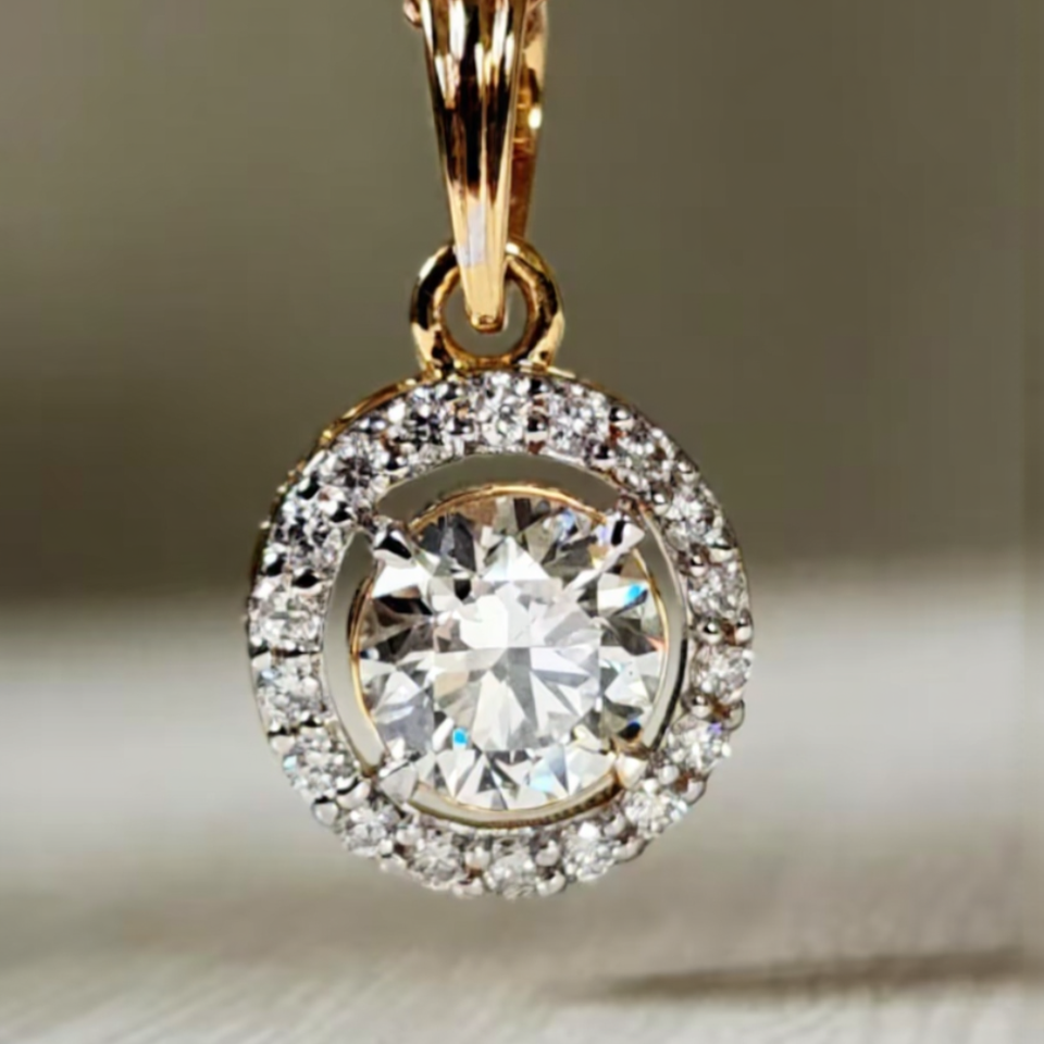 จี้เพชรทรงโซลิแตร์ 1.2 กะรัต ผลิตในห้องปฏิบัติการ พร้อมวงแหวนประดับเพชรแบบฮาโล ความใสระดับ VS สี EF ชุบโรเดียม ทอง 14K เครื่องประดับคุณภาพสำหรับผู้หญิง