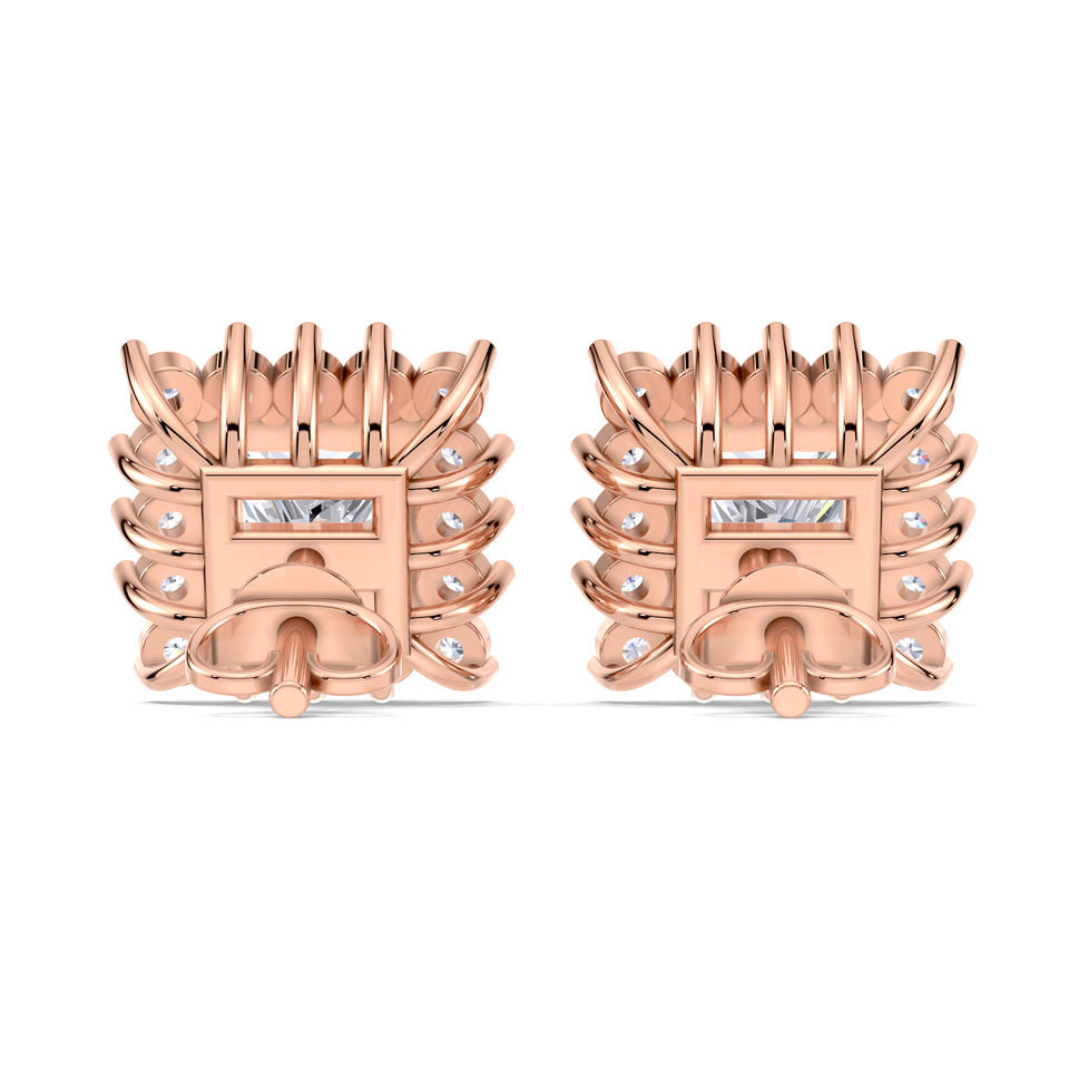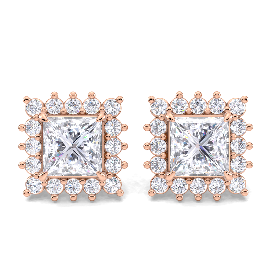 ต่างหูเพชรทรงปรินเซสคัท 1.32 กะรัต ประดับด้วยวงแหวนเพชรสองวง ทอง 9K สีเหลือง ขาว และโรสโกลด์ แบบเกลียวหลัง ดีไซน์หรูหราสำหรับเจ้าสาว