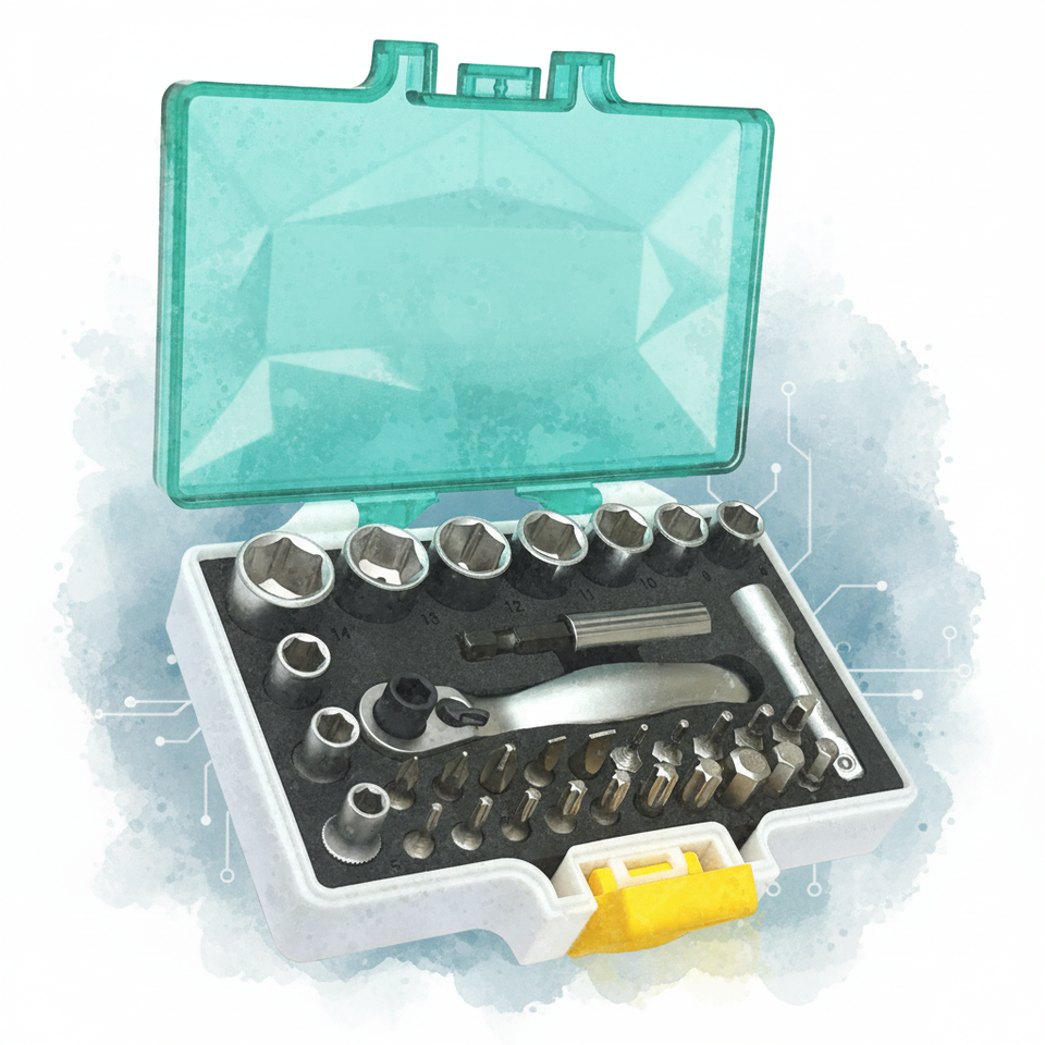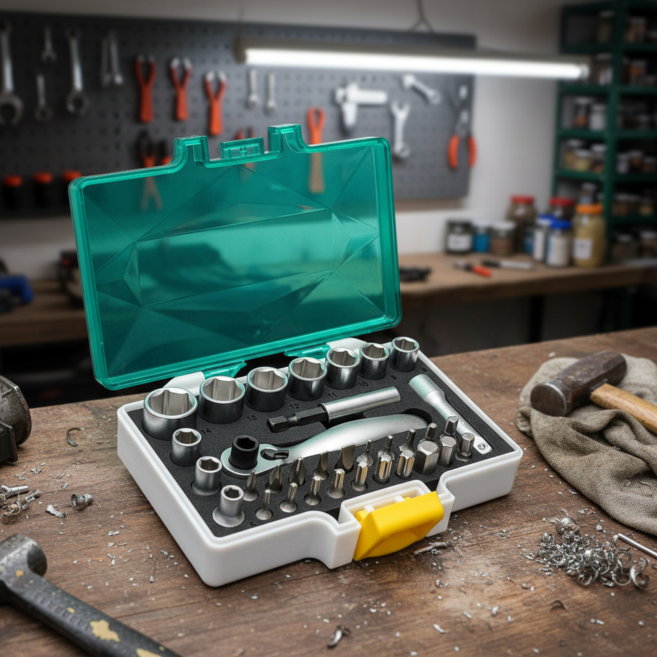 ชุดซ็อกเก็ตและบิต 1/4 นิ้ว 33 ชิ้น พร้อมด้ามจับแบบหัวงอได้สองด้านในกล่องแข็ง