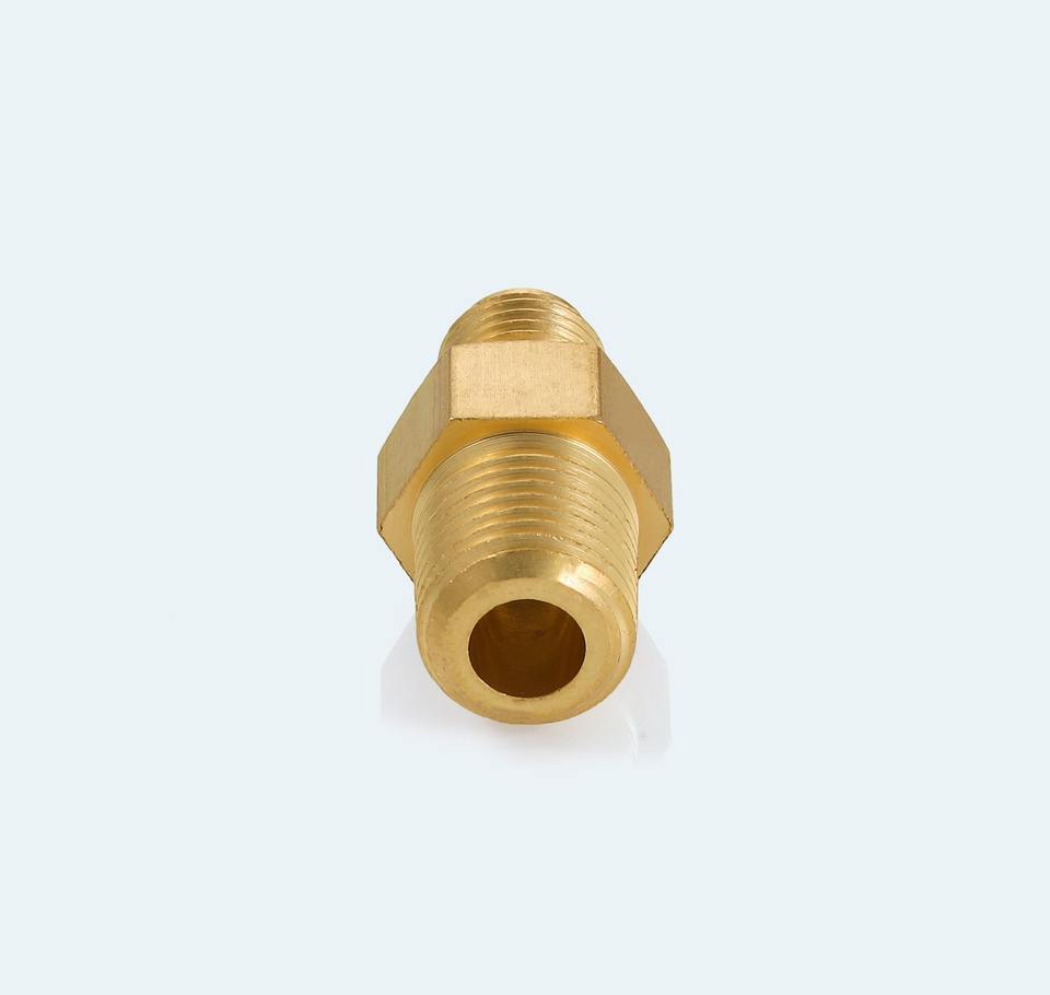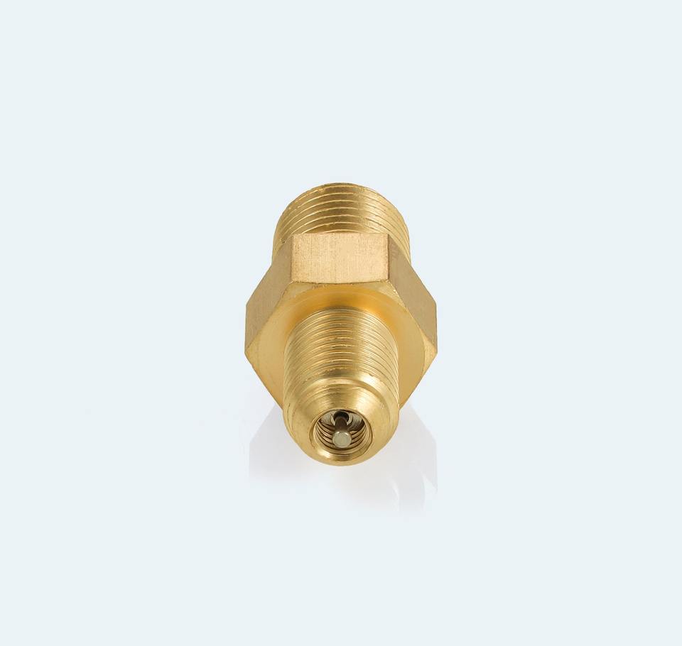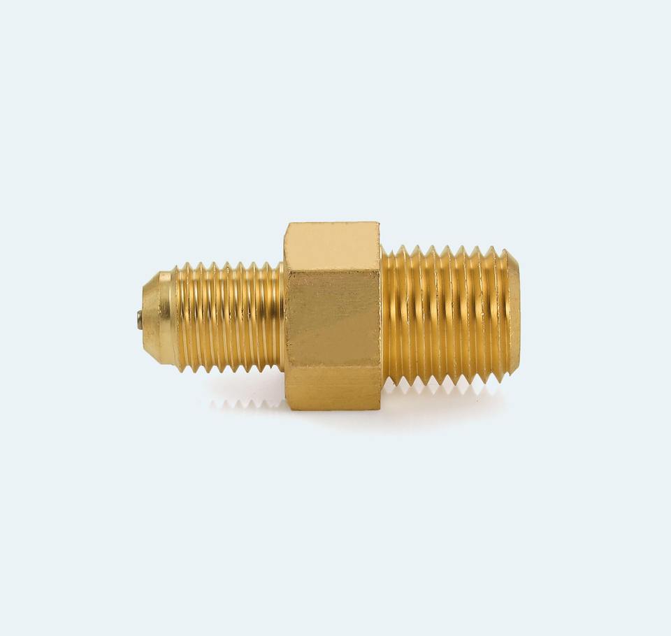 อะแดปเตอร์ทองเหลืองแบบ Half Union ขนาด 1/4 นิ้ว (Flare) x 1/8 นิ้ว (NPT) แบบ SAE 45 องศา พร้อมเกลียว 7/16-20 ถึง 1/8-18 รองรับแรงดัน 550 PSI สำหรับถัง 3 กิโลกรัม ผลิตในอินเดีย