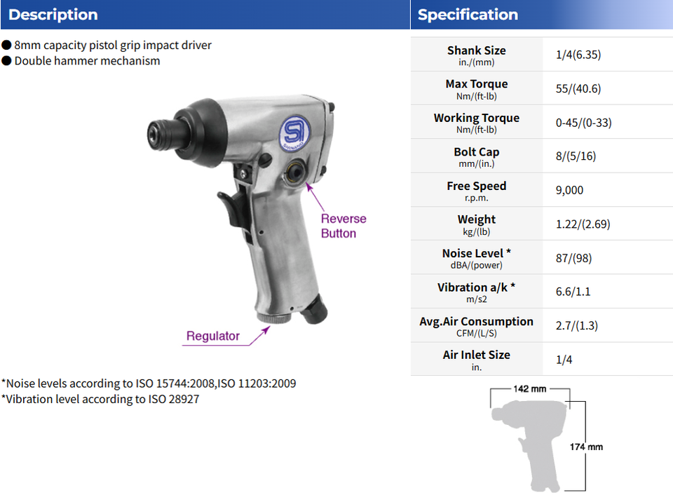 ไขควงลมขนาด 1/4 นิ้ว ความจุ 8 มม. แบบค้อนคู่ ด้ามจับปืนพก ตัวเครื่องอะลูมิเนียม ปรับความเร็วได้ ยี่ห้อ SHINANO รุ่น SI-1356D 55