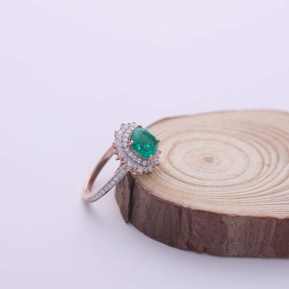 แหวนเพชรทรงคุชชั่น 1.40 กะรัต สีเขียว ผลิตในห้องปฏิบัติการ ประดับด้วยเพชรทรงกลม บนตัวเรือนเงินแท้ 925 ชุบโรเดียม