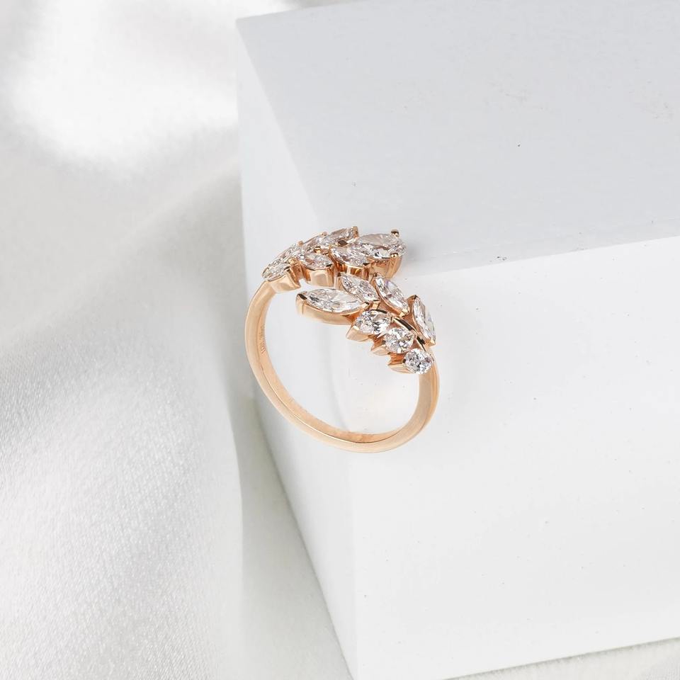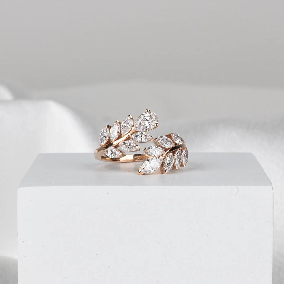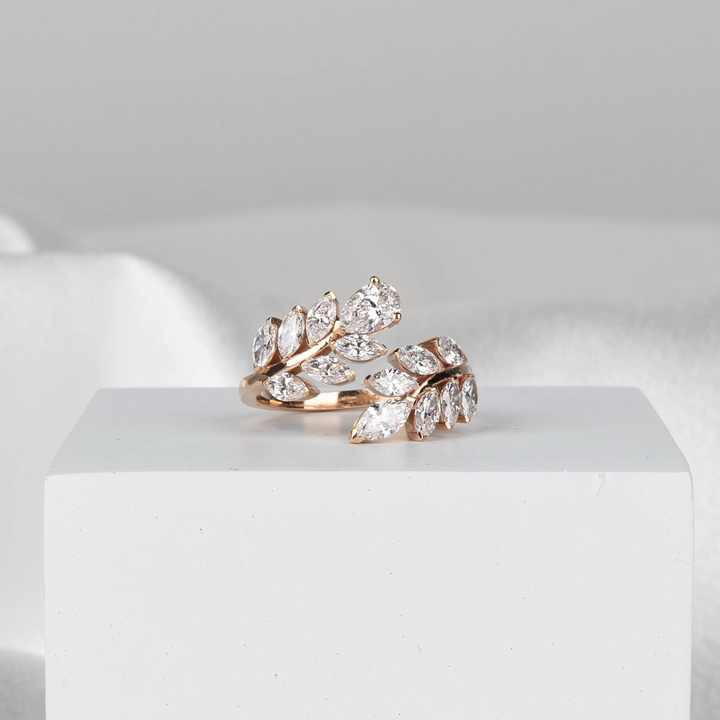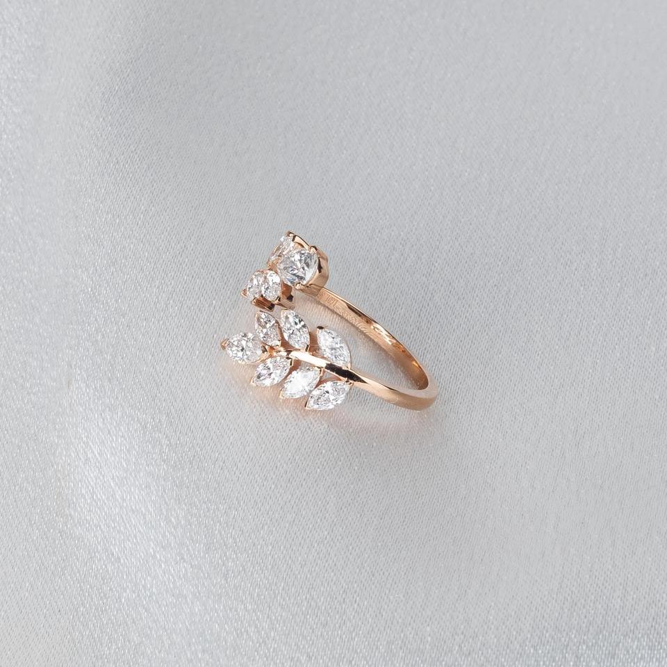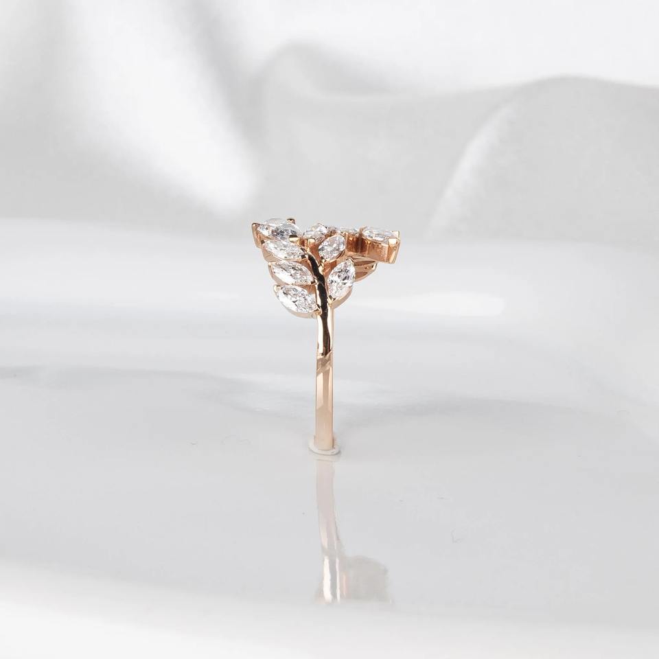 แหวนเพชรทรงมาร์คีส์สีขาว 1.40 กะรัต ฝังแบบหนามเตย ความสะอาดระดับ VS+ รับรองโดย IGI ดีไซน์ใบไม้เรียบหรู ทองคำแท้ 14K วงแหวนแบบเปิดปรับขนาดได้