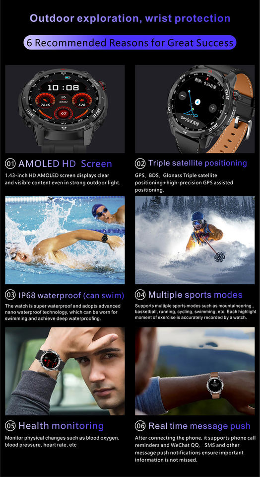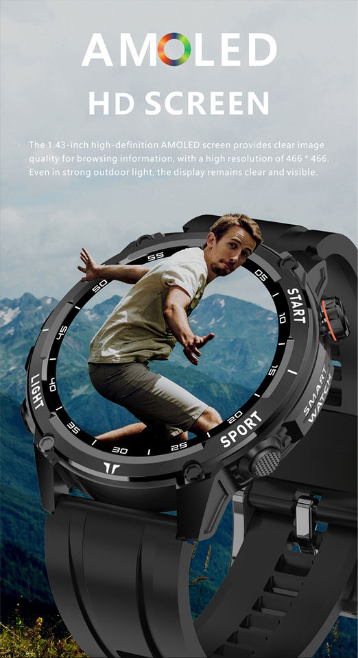 ฟังก์ชัน:ติดตาม GPS, โหมดกีฬามากกว่า 100 โหมด, การแจ้งเตือนข้อความ/นาฬิกาปลุก, โทร, สุขภาพ