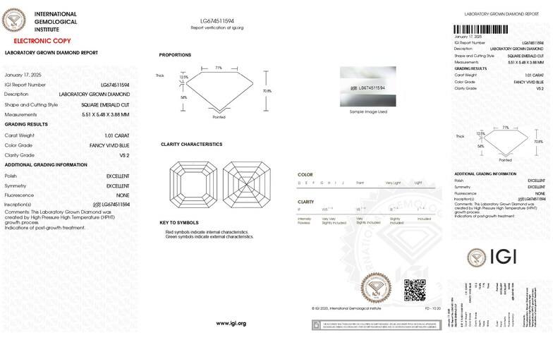 เพชรแล็บสีน้ำเงินสดใสทรงแอสเชอร์ 1.5 กะรัต รับรองโดย IGI ความสะอาดระดับ VS เพชรปลูกในห้องปฏิบัติการ ราคาขายส่ง B2B