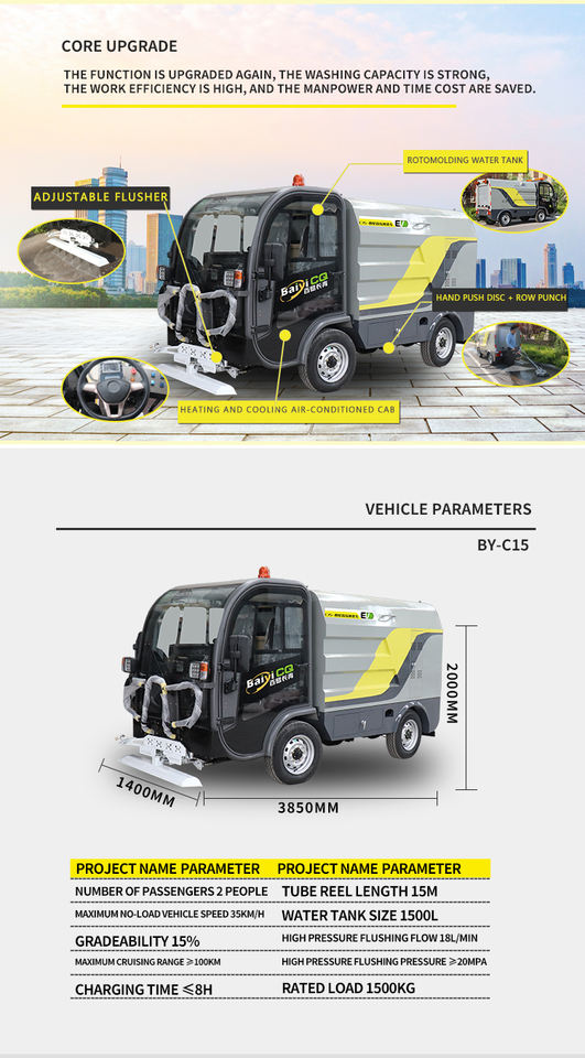 รถทำความสะอาดแรงดันสูงพร้อมถังเก็บน้ำ 1.5 ลูกบาศก์เมตร ระบบพ่นละอองน้ำด้านหลังและล้างแถวหน้า
