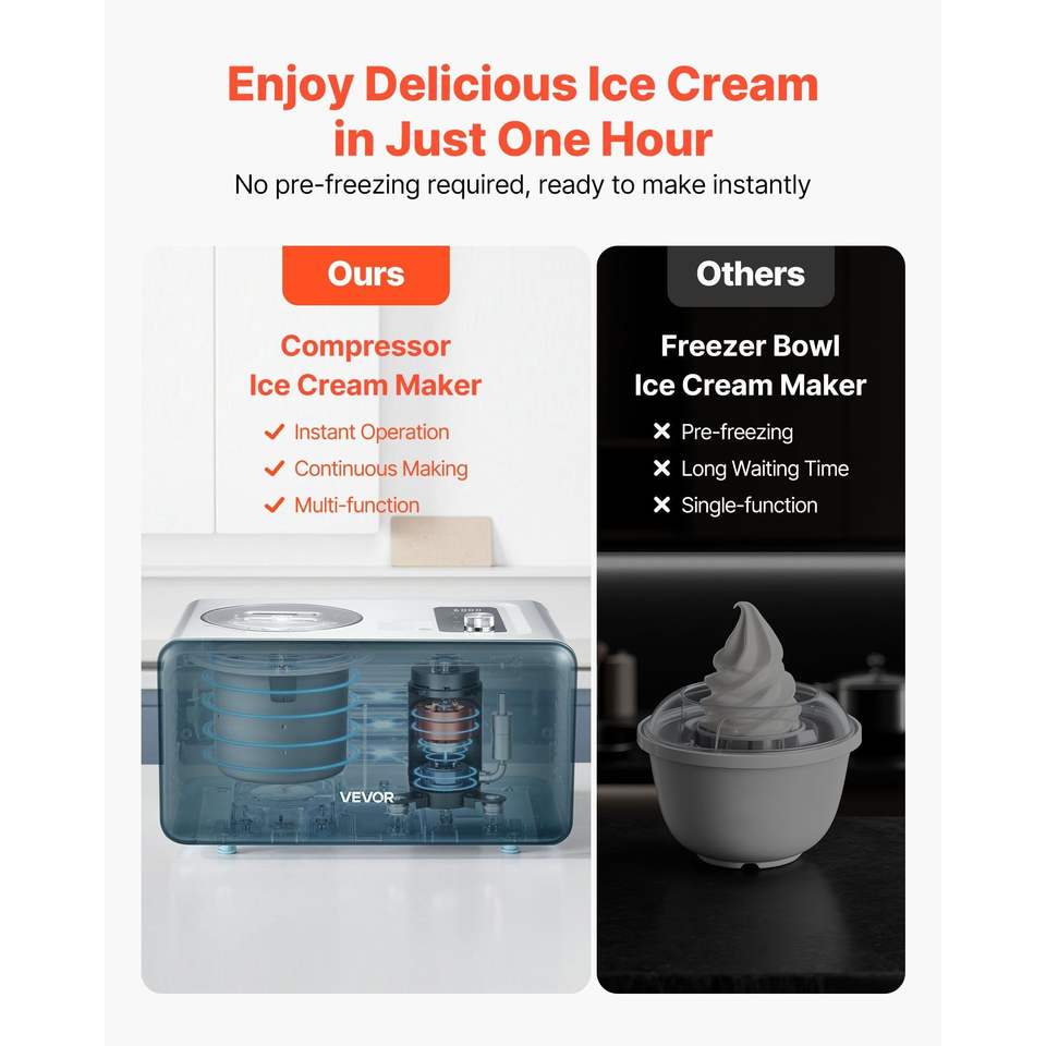 เครื่องทำเจลาโต้และซอร์เบต์ไฟฟ้าอัตโนมัติขนาด 1.5 ควอร์ต พร้อมคอมเพรสเซอร์ในตัว ไม่ต้องแช่แข็งล่วงหน้า 3 โหมด เครื่องทำไอศกรีม