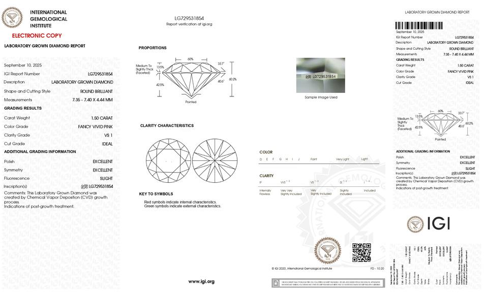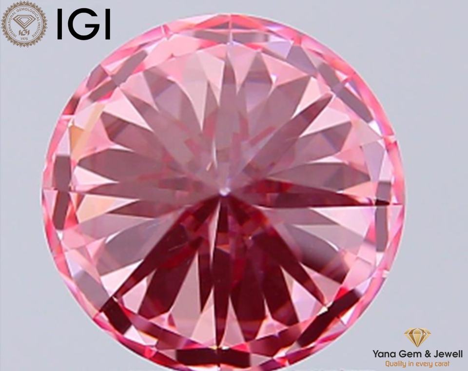 เพชร CVD ที่ได้รับการรับรองจาก IGI น้ำหนัก 1.50 กะรัต ขนาด 7.35 มม. ทรงกลม ความสะอาดระดับ VS1 สีชมพูสดใสแฟนซี สำหรับทำเครื่องประดับตามสั่ง
