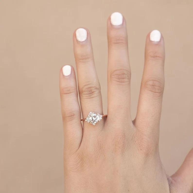 แหวนหมั้นเพชรทรงกลม 1.50 กะรัต ผลิตในห้องปฏิบัติการ ประดับด้วยเพชรแบบ Halo ตัวเรือนทองคำแท้ 14K สีโรสโกลด์ เครื่องประดับเจ้าสาวชั้นดีจากสหรัฐอเมริกา