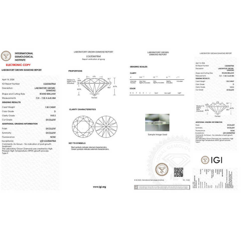 เพชรทรงกลม 1.50 กะรัต เพาะเลี้ยงในห้องปฏิบัติการ ความสะอาดระดับ VVS2 การเจียระไนอย่างยอดเยี่ยม รับรองโดย IGI สำหรับทำเครื่องประดับ สี D