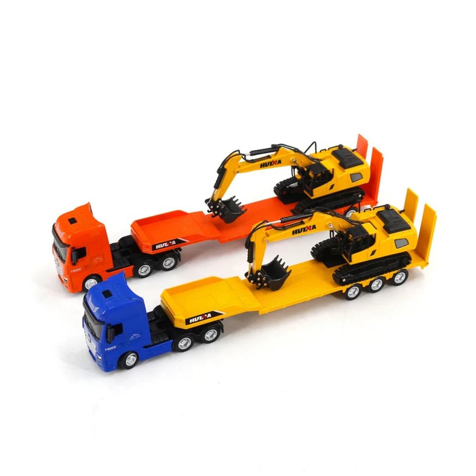 รถบรรทุกพ่วงพื้นเรียบแบบจำลองโลหะผสมอะลูมิเนียม Huina 1729 ขนาด 1/50 พร้อมรถขุดสำหรับงานก่อสร้าง