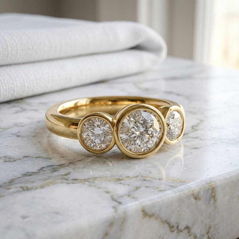 แหวนเพชรเม็ดเดี่ยวทรงกลมเจียระไนแบบบริลเลียนท์ น้ำหนัก 1.55 กะรัต ทอง 14k สี E เพชรเพาะเลี้ยงในห้องปฏิบัติการ ฝังแบบเบเซล พร้อมใบรับรอง