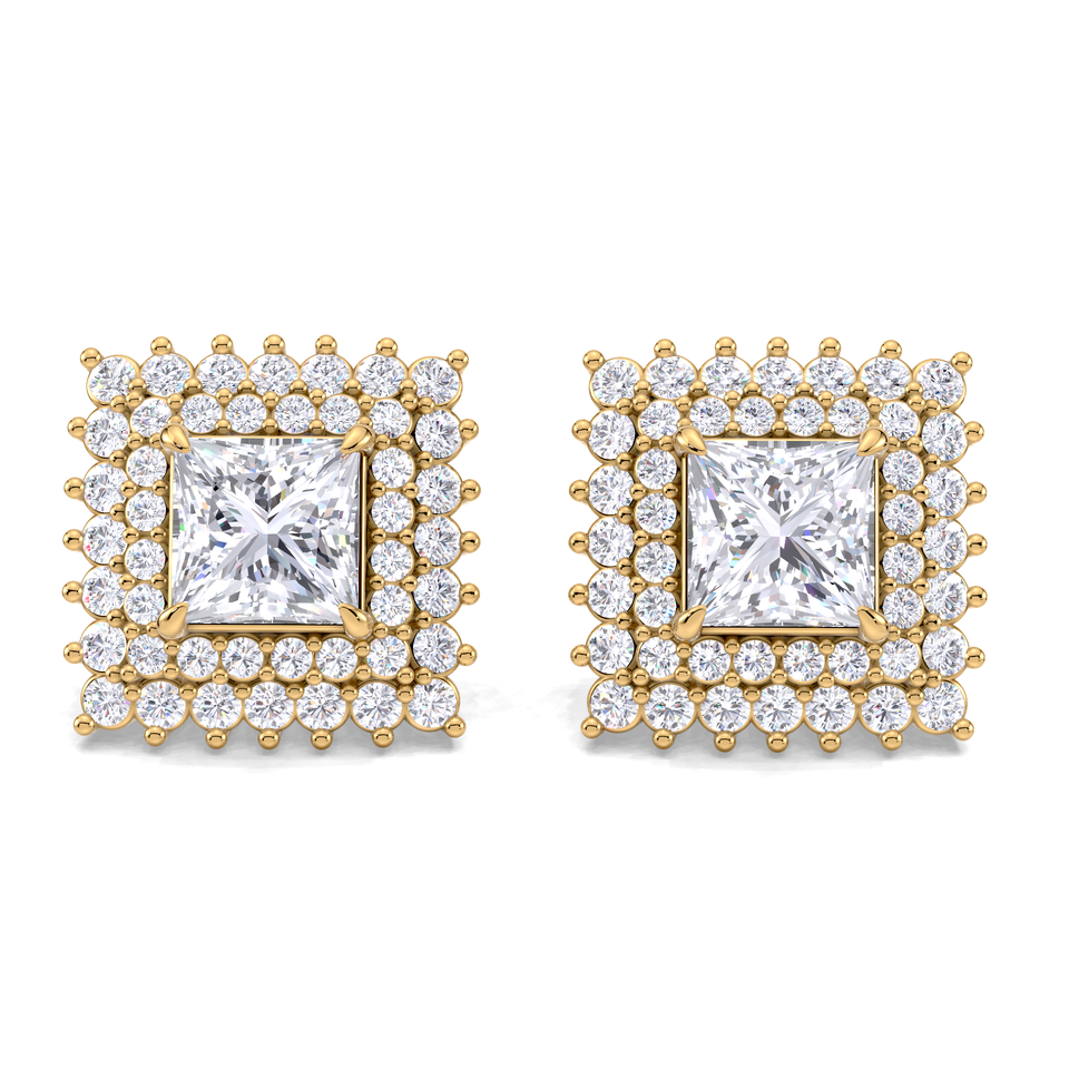 ต่างหูเพชรทรงปริ๊นเซสคัท 1.58 กะรัต ประดับด้วยเพชรแบบดับเบิ้ลฮาโล ทองคำขาว 14K ชุบโรเดียม แบบเกลียวหลัง