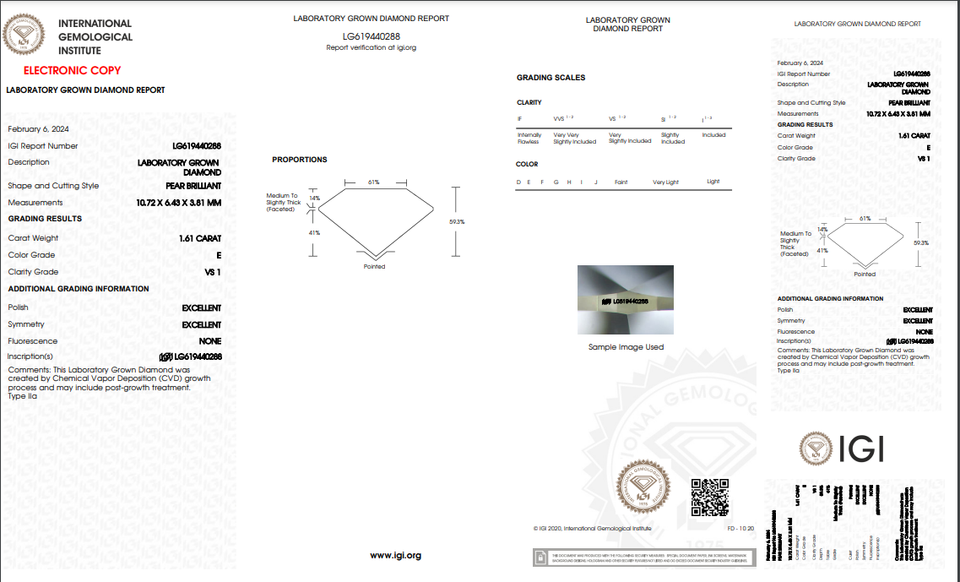 เพชรที่ปลูกในห้องทดลองขนาด1.61กะรัตได้รับการรับรองว่าอีสี VS1ความชัดเจนหินห้องแล็บ