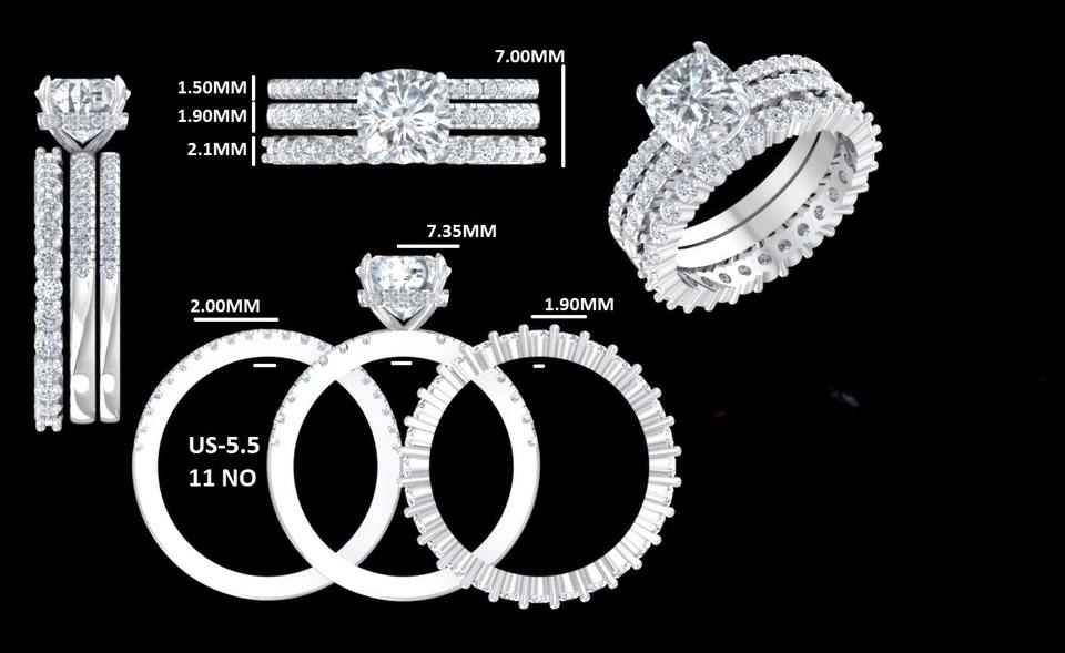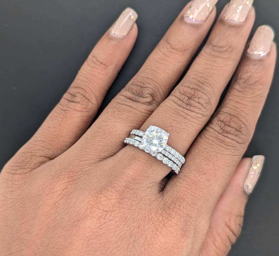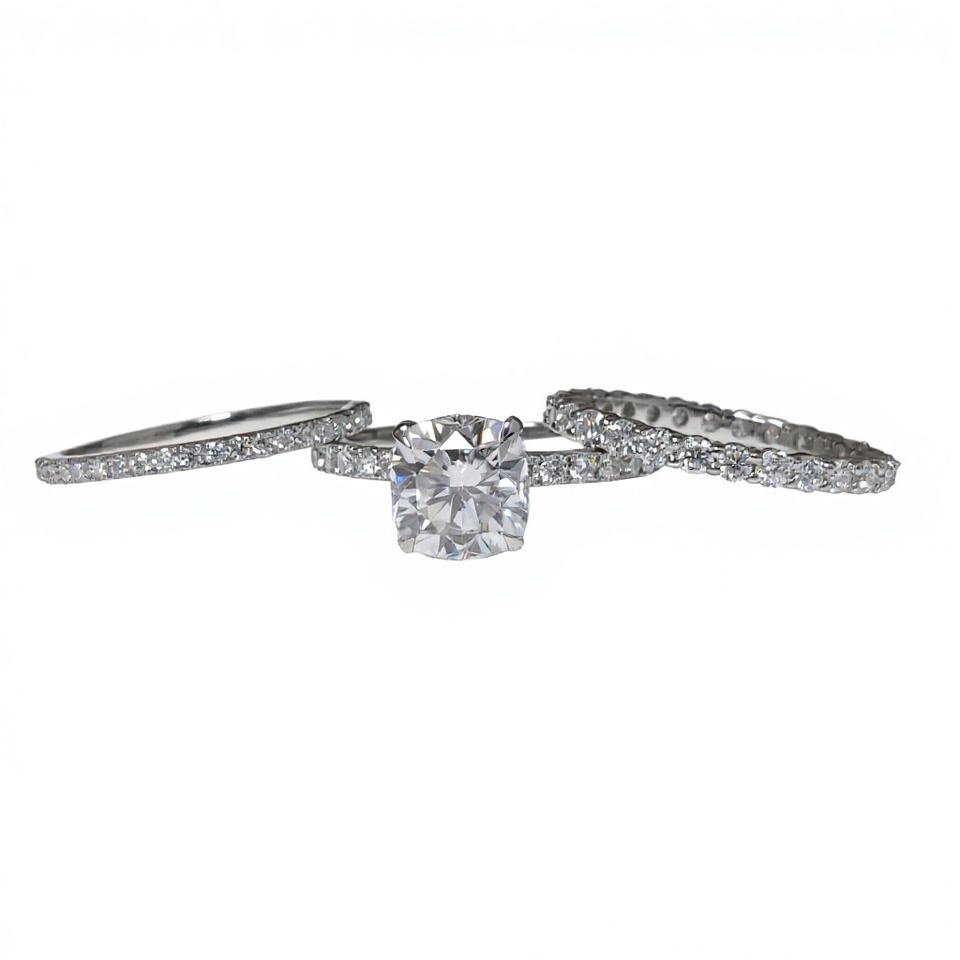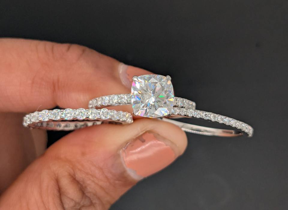 แหวนหมั้นเพชรโมอิสซาไนต์ทรงคุชชั่นคัท 1.65 กะรัต ชุดแหวนสามวงสำหรับผู้หญิง ทองคำขาว 14K แท้ ชุดเจ้าสาวประดับมุกน้ำจืด