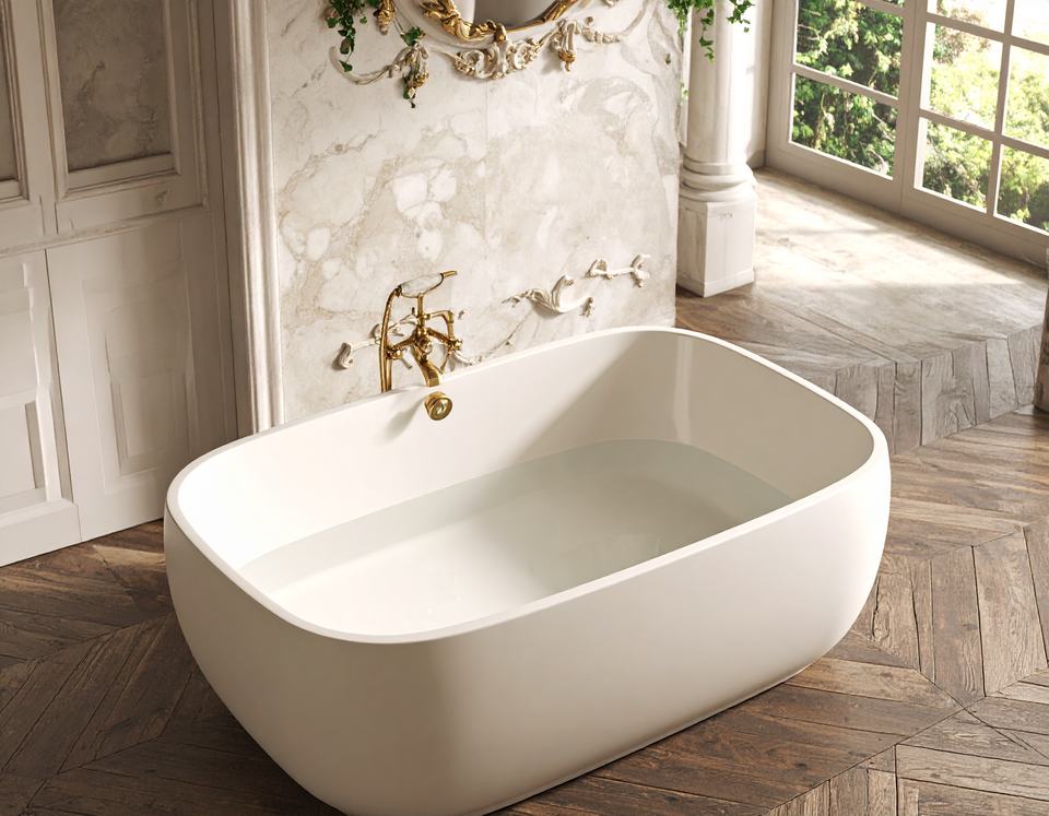 อ่างอาบน้ำอะคริลิคทรงรีคลาสสิกขนาด 1.6 ม. ดีไซน์มินิมอลแบบเส้นตรง พร้อมระบบโอเวอร์โฟลว์ สีขาวทันสมัย สำหรับห้องน้ำโรงพยาบาล โรงแรม
