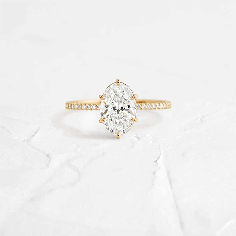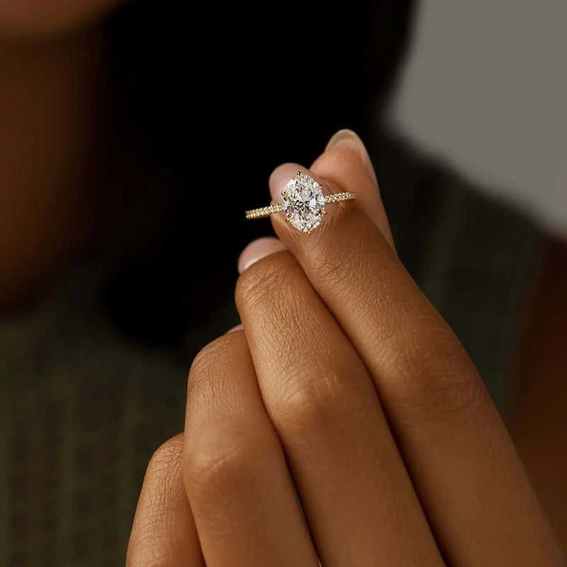 แหวนหมั้นเพชรทรงรี 1.70 กะรัต ประดับด้วยวงแหวนรอบเพชรแบบซ่อน ทำจากทองคำ 14K งานฝีมือสำหรับเจ้าสาว