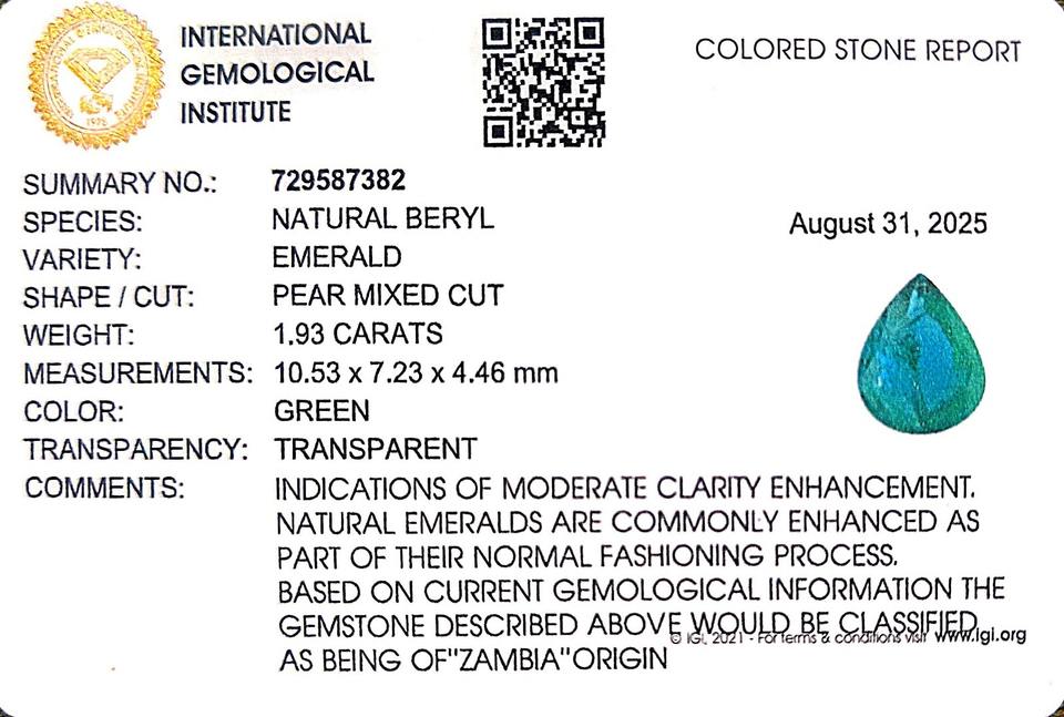 พลอยมรกตสีเขียวทรงลูกแพร์ 1.93 กะรัต จากแซมเบีย แบบเม็ดเดี่ยว