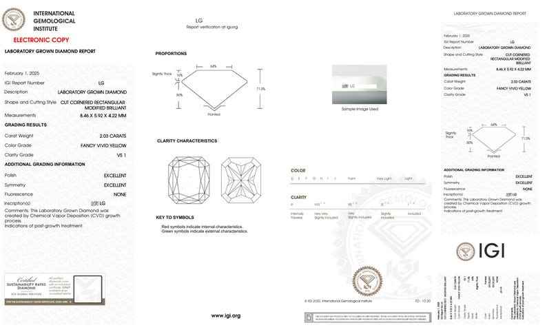 เพชรทรงรัศมี 1 กะรัต สีเหลืองสดใส ผลิตในห้องปฏิบัติการ ได้รับการรับรองจาก IGI ความสะอาดระดับ VS เพชรปลูกในห้องปฏิบัติการแบบเม็ดเดี่ยว