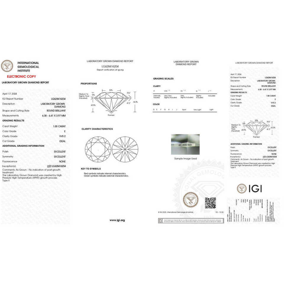 เพชรทรงกลม 1 กะรัต เพาะเลี้ยงในห้องปฏิบัติการ ระดับความสะอาด VVS2/E เครื่องประดับพรีเมียม ขนาดหน้าตัด 59% และความลึก 62.2%