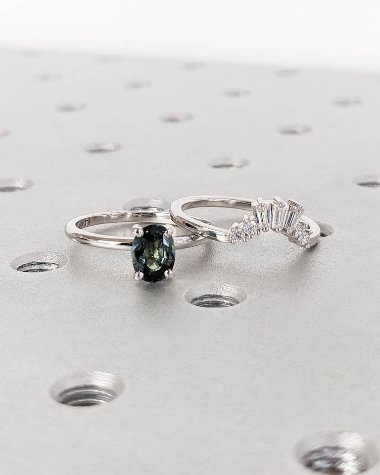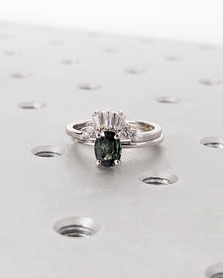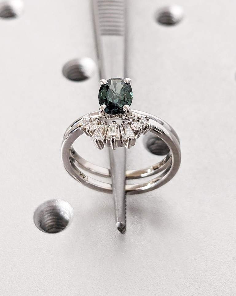 แหวนแซฟไฟร์สีน้ำเงินอมเขียว1กะรัตชุดแหวนซ้อนกันแบบอาร์ตเดคโคสำหรับเครื่องประดับภรรยา