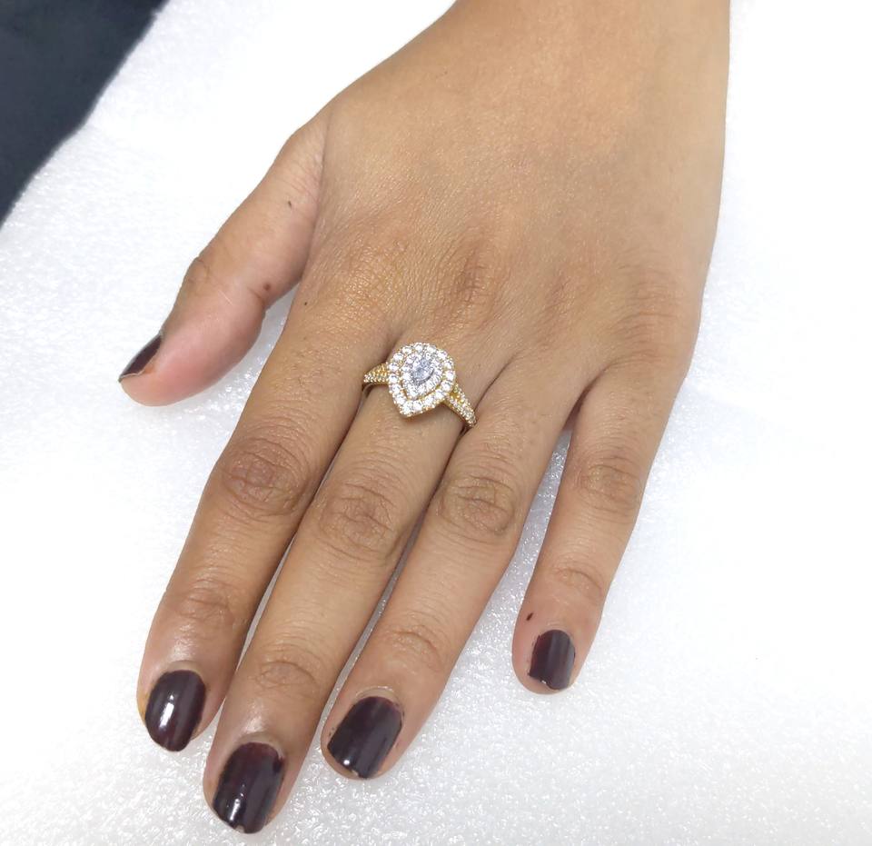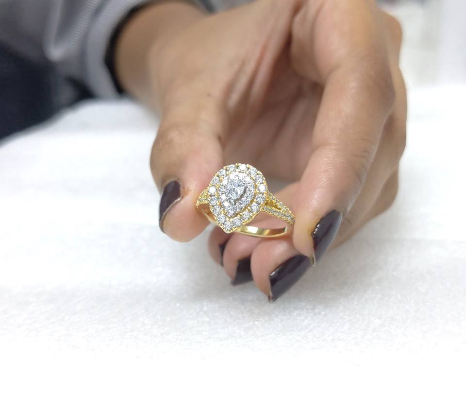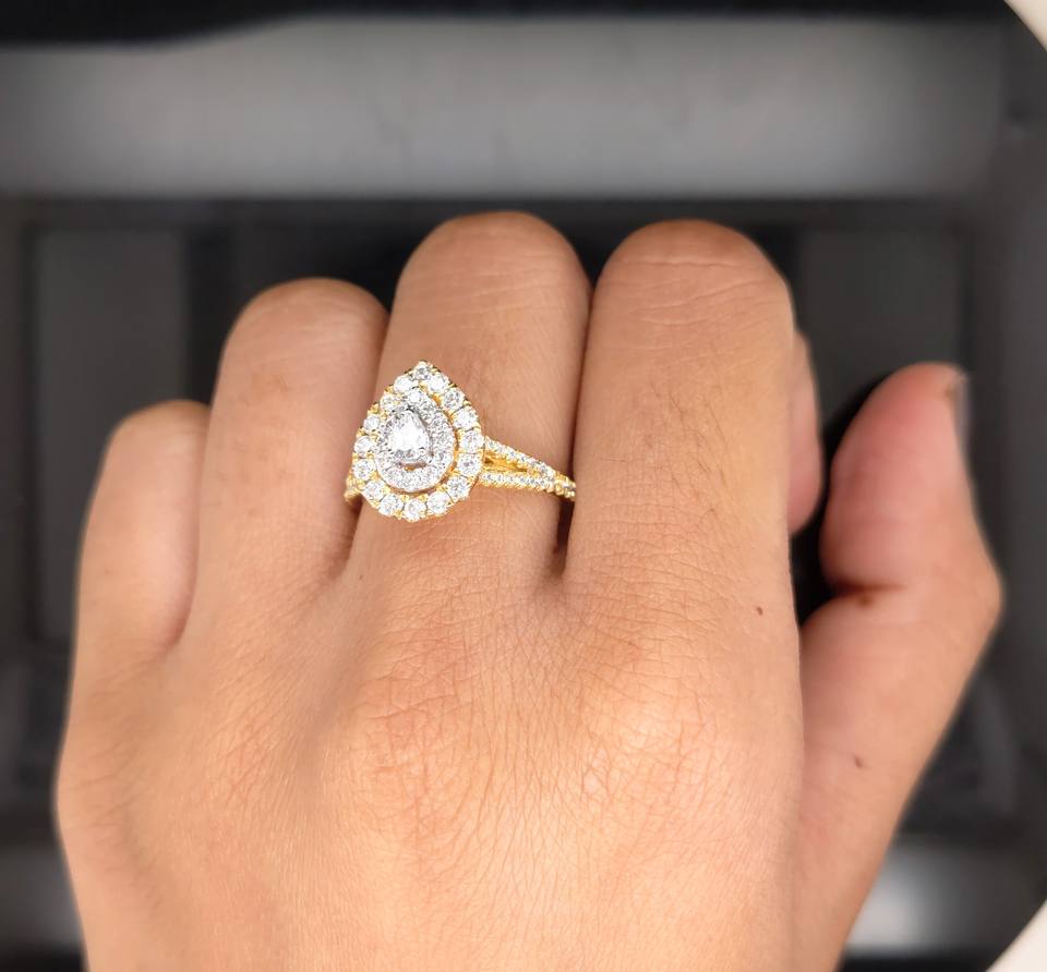 แหวนหมั้นวินเทจทรงลูกแพร์เพชรเพาะเลี้ยง 1 กะรัต ประดับด้วยวงแหวนสองวง ได้รับการรับรองจาก IGI สำหรับผู้หญิง ทองคำแท้ 14K สีเหลือง/สีโรสโกลด์ สำหรับงานแต่งงาน