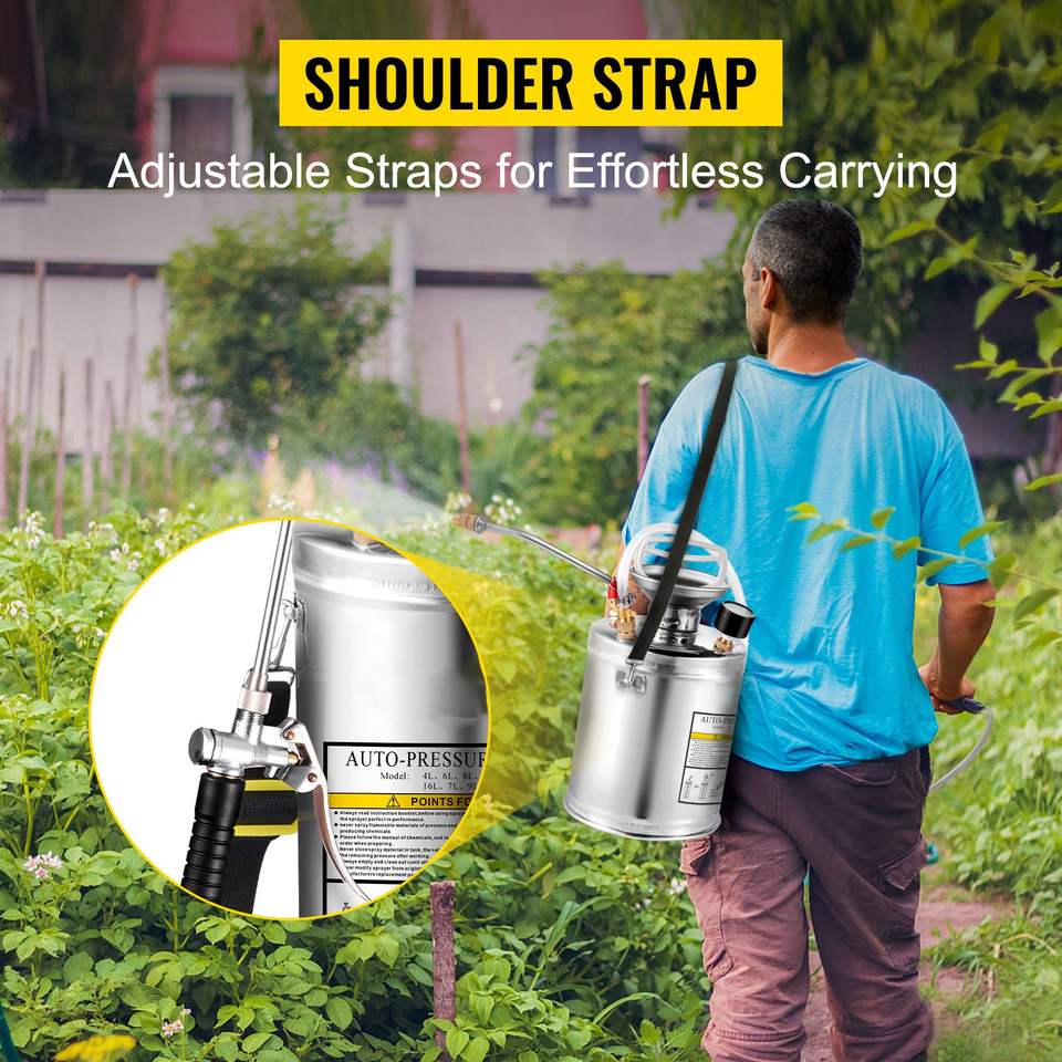 เครื่องพ่นยาแบบมือถือสแตนเลสขนาด 1 แกลลอน พร้อมก้านฉีด 12 นิ้ว สายเสริมแรง 3 ฟุต พร้อมเกจวัดแรงดัน วาล์วนิรภัย และหัวฉีดปรับได้