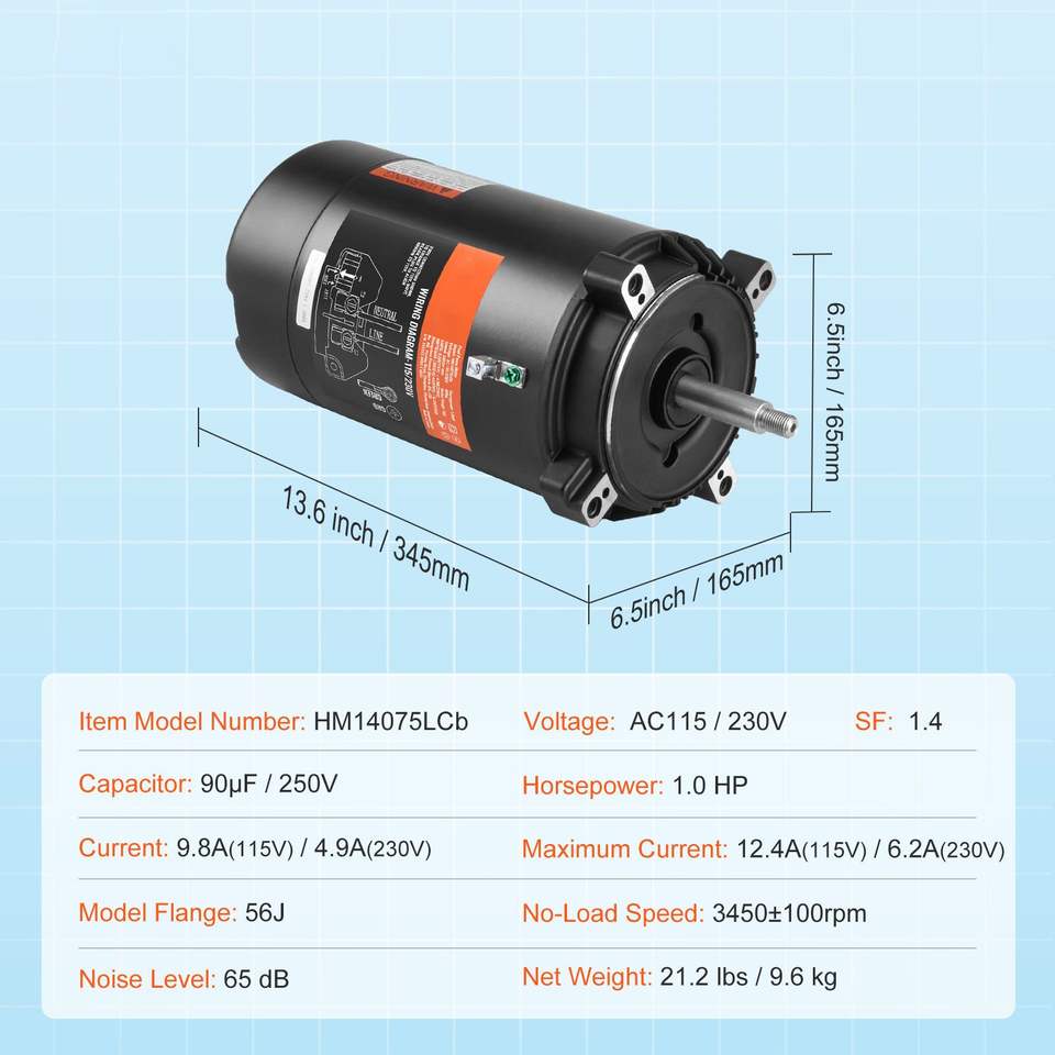1 HP 56J Frame Pool Pump Motor 115V/230V 3450 RPM 60Hz 1.4 Service Factor 90 F/250V Capacitor CCW 9.8/4.9 Amps